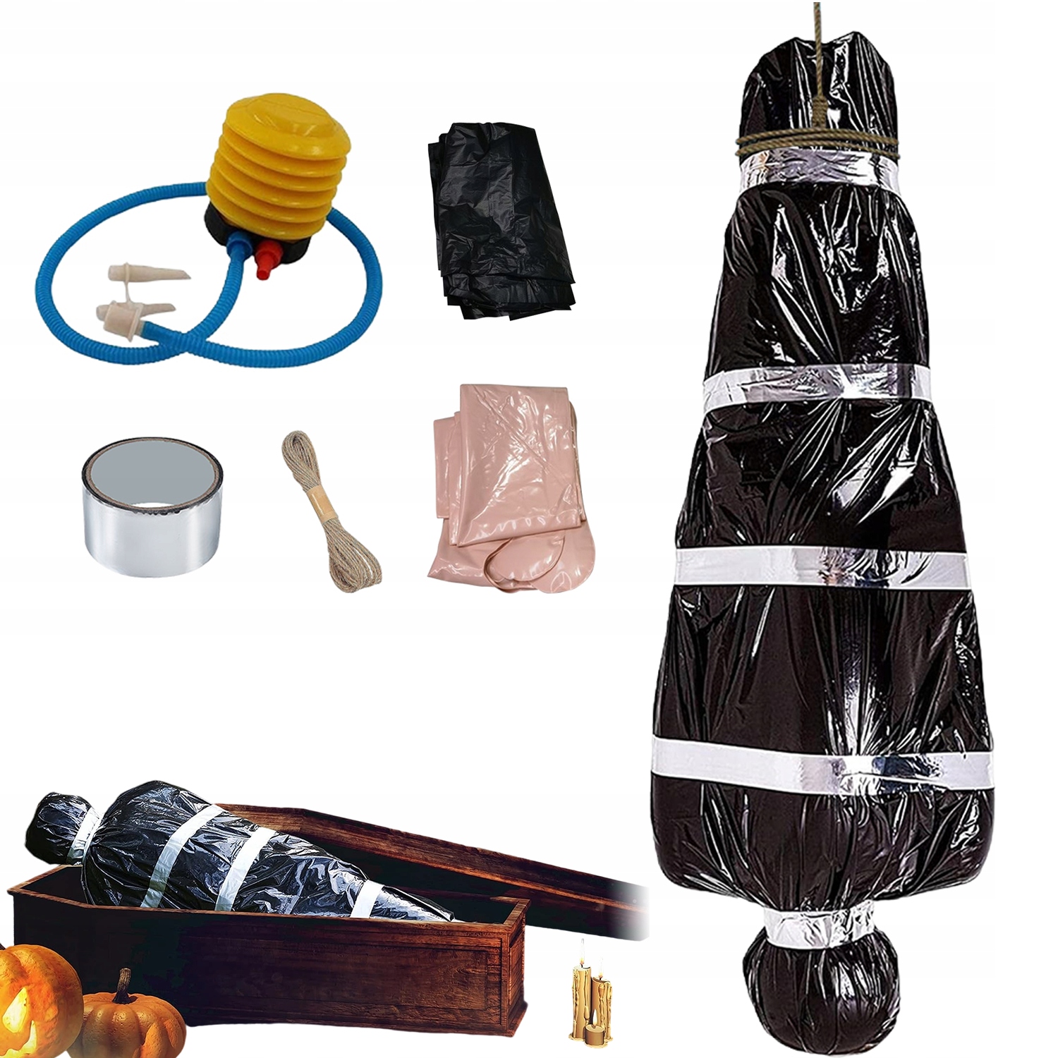 - Просте збирання: просто помістіть надувну фігуру в чорний поліетиленовий пакет і закріпіть мотузкою та стрічкою.