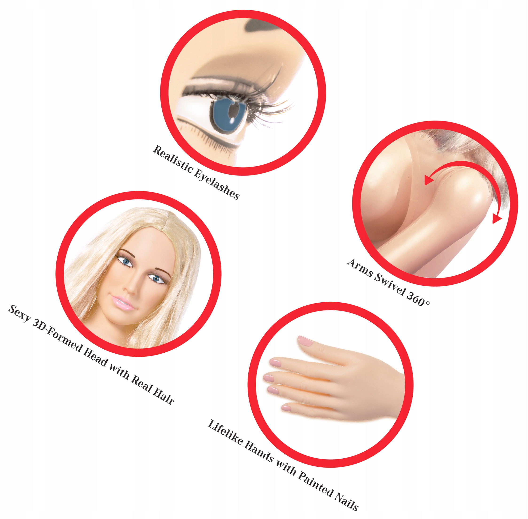 Обличчя сформоване в 3D, дуже природне. Реалістичні, довгі та кокетливі вії, справжнє волосся, м'які, придатні для розчісування, миття, погладжування чи запаху.