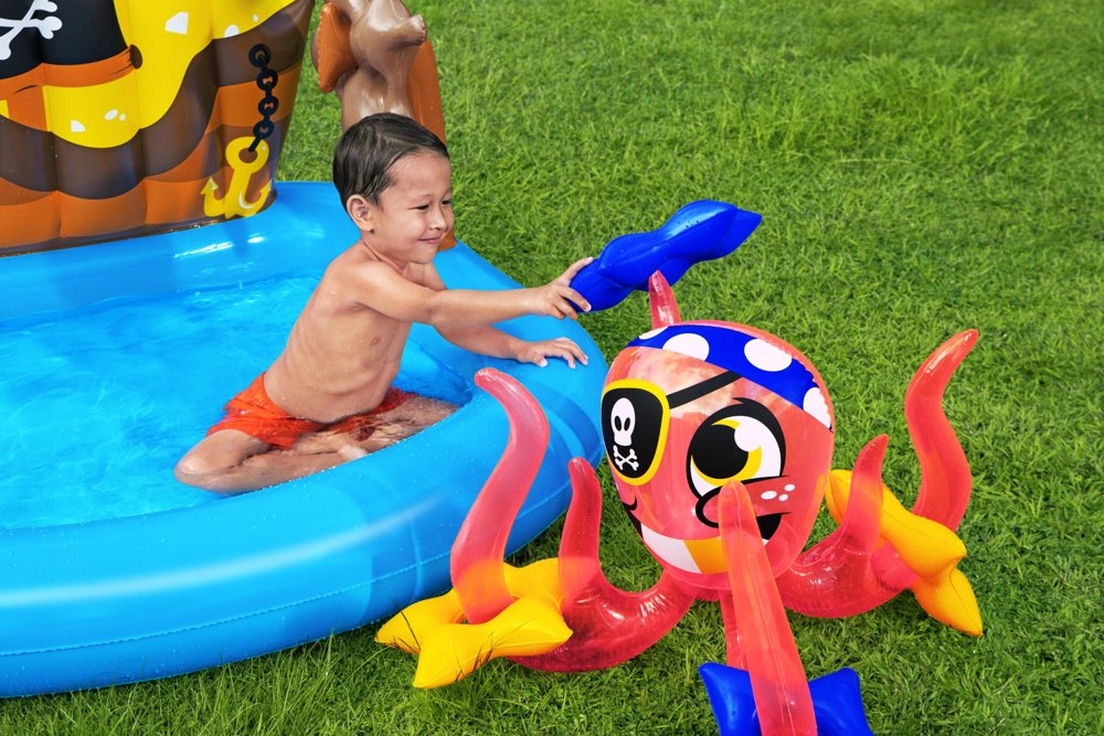 Хочете подарувати своїй дитині незабутню розвагу в комфорті свого саду? Надувний ігровий майданчик перетворить його на справжній центр розваг для вашої дитини, а басейн з надувними атракціонами, такими як рухомий кермо та кільця для метання, неодмінно порадує вашого малюка та стане його улюбленим місцем для ігор. Басейн виготовлений з м'якого, але міцного матеріалу і максимально безпечний для найменших дітей.