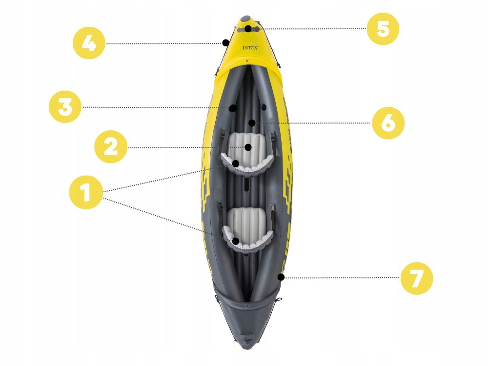 Жовтий колір і спортивна графіка роблять його добре помітним у воді. Він виготовлений із міцного та довговічного вінілового матеріалу - SuperStrong PVC - забезпечує чудову довговічність, високу стійкість до ударів і стирання. Він має обтічний дизайн, який полегшує веслування. Підлога в байдарці надувна, а для зручності використання вона обладнана надувними сидіннями зі спинкою.
