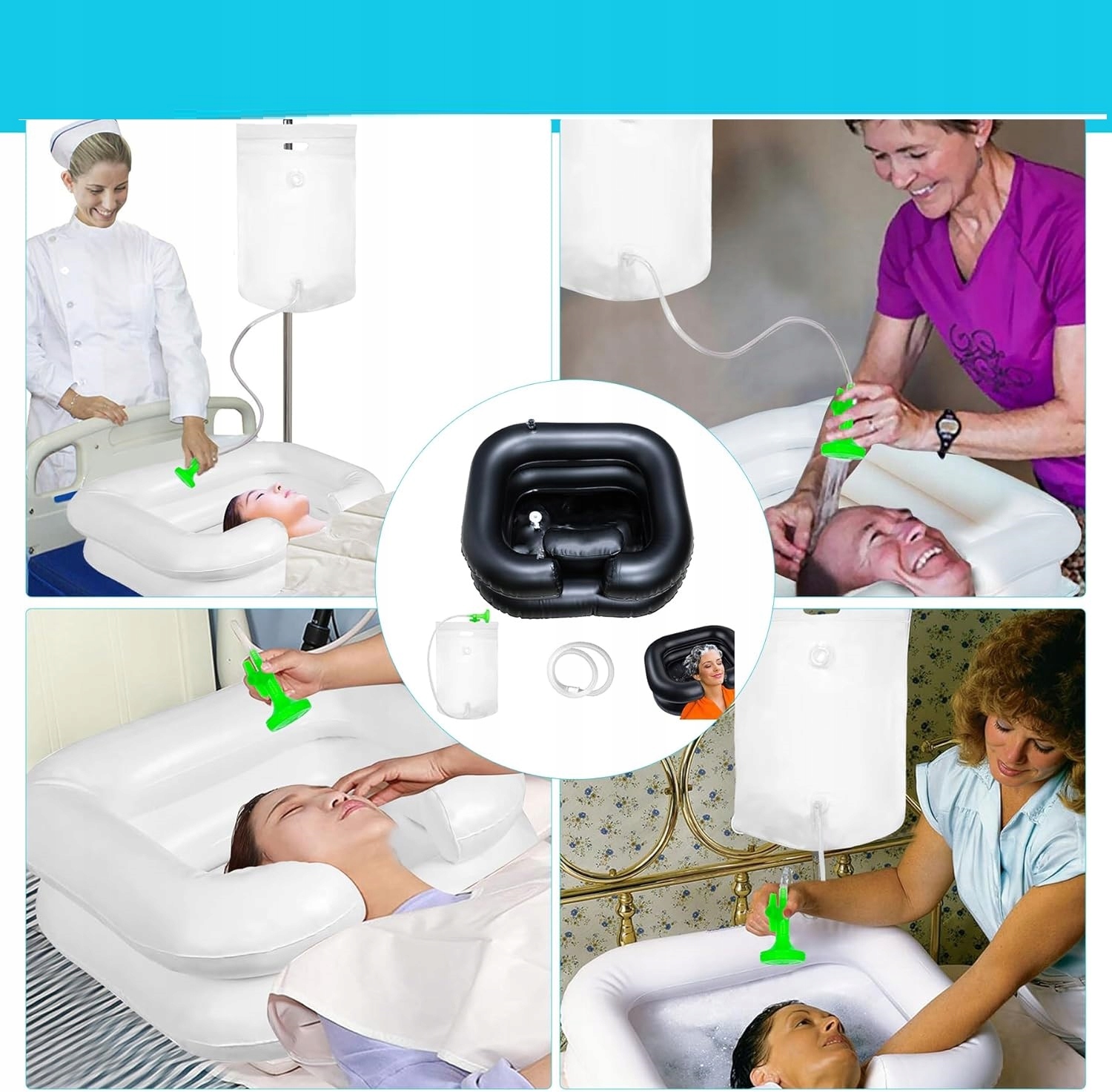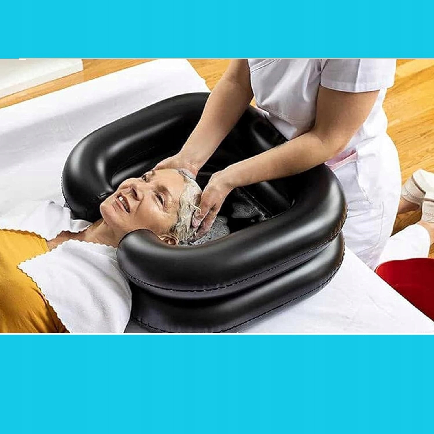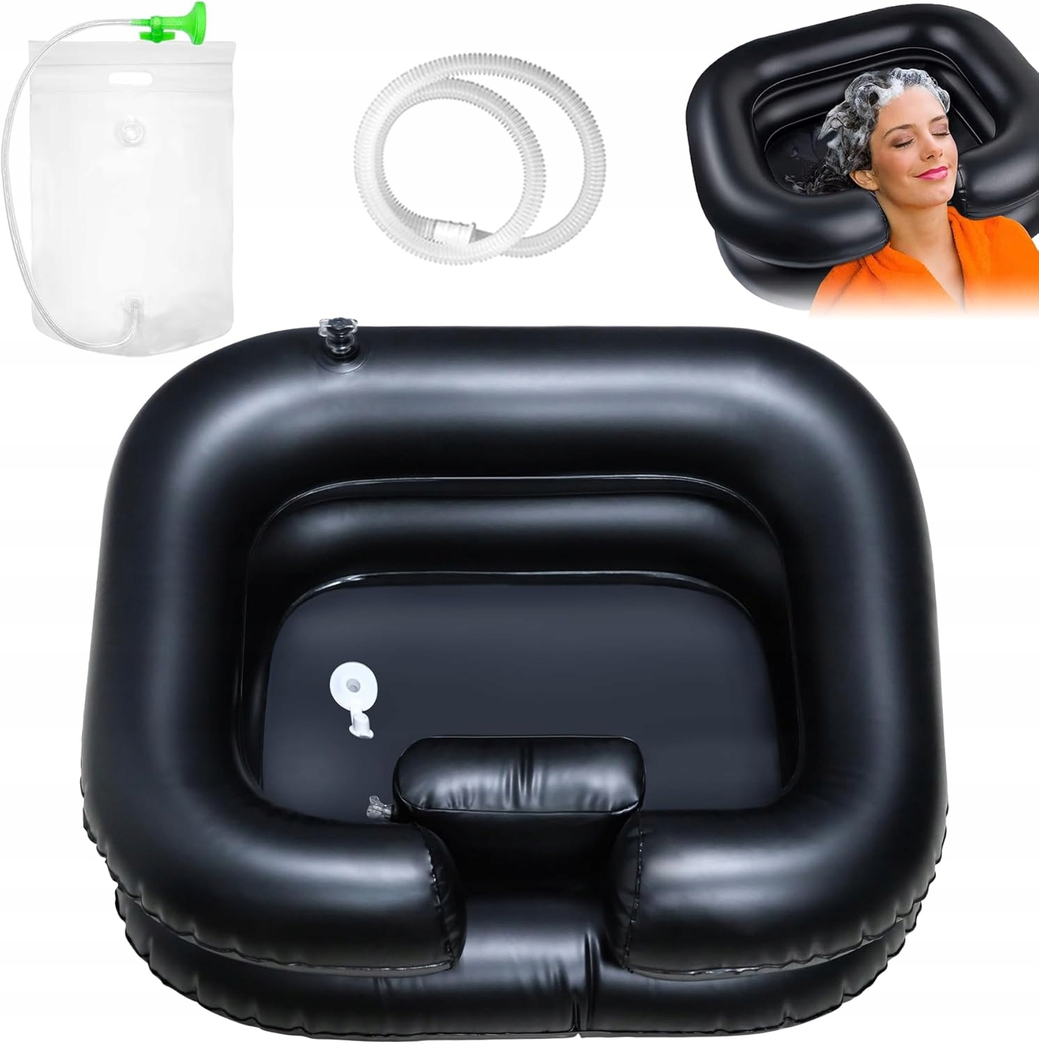 - Надувний умивальник дозволяє зручно мити голову практично де завгодно - навіть у ліжку. Він ідеально підходить для дітей, вагітних жінок, людей похилого віку та людей після операцій або з обмеженою рухливістю. Це полегшує догляд за волоссям і в той же час підвищує комфорт і відчуття розслаблення під час миття голови.