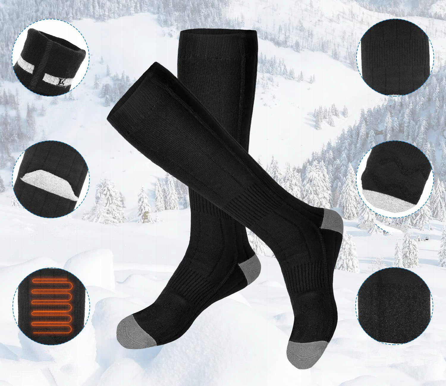 нагріті акумуляторні шкарпетки оснащені кільцевим нагрівальним елементом, а електричні шкарпетки були модернізовані в області опалення. Він має дуже гарне поглинання води, дихання, гнучкість та м'якість. Він забезпечує комфортне і навіть нагрівання ніг, при цьому покращуючи кровообіг, зберігаючи тепло взимку.