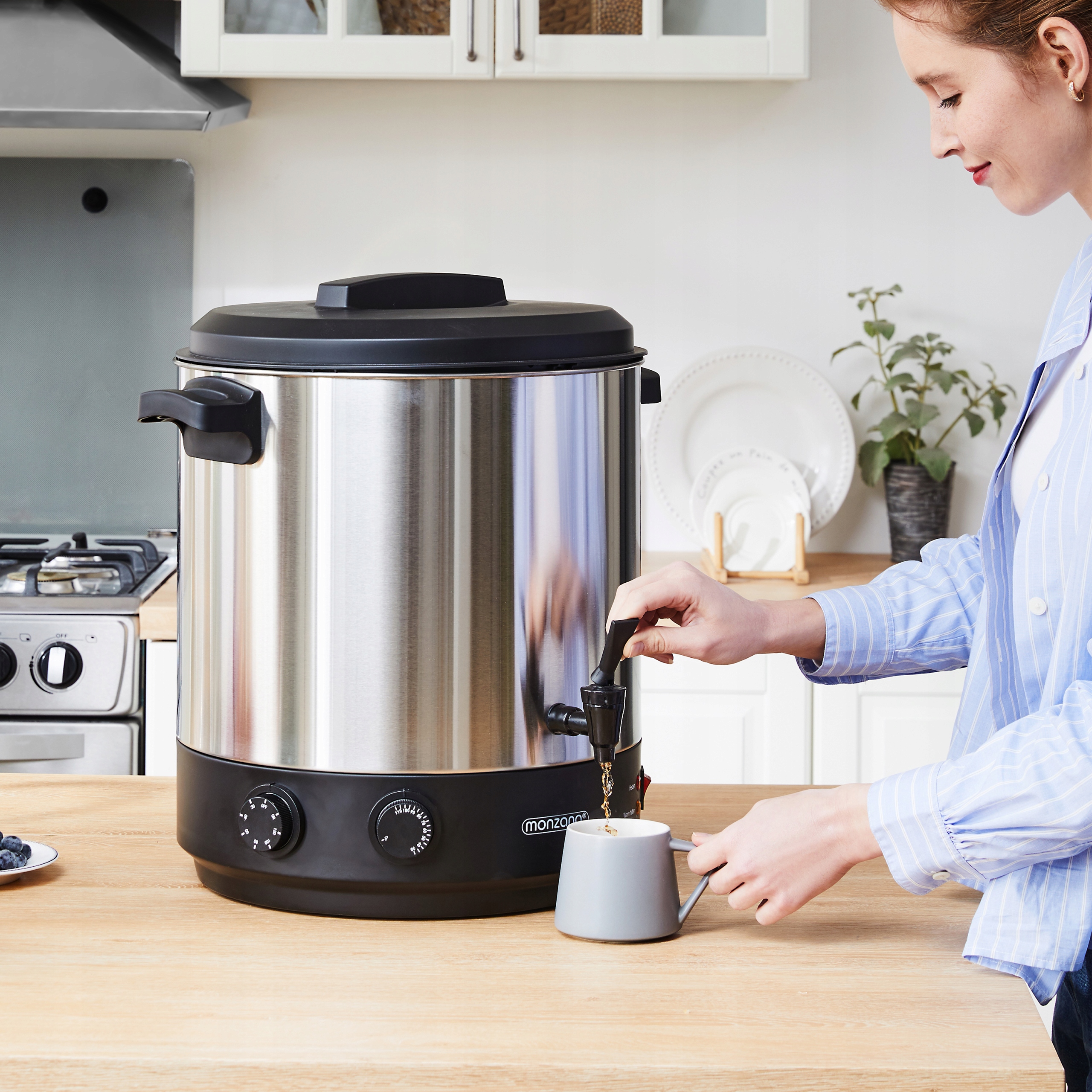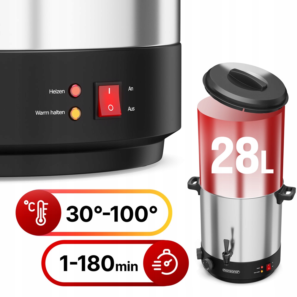 У 28-літровій ємності з вбудованим краном ви можете легко кип’ятити до 14 банок по 1 літр кожна з гвинтовою кришкою або гумовим кільцем.