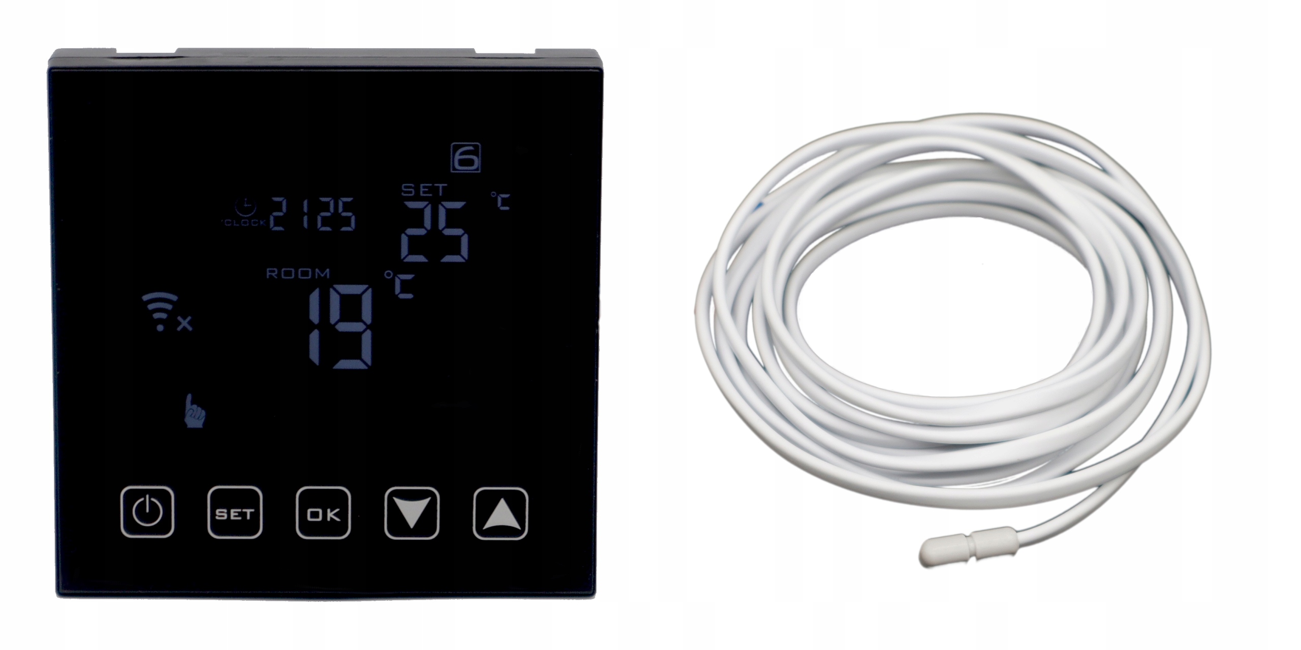 Контролер має вбудований датчик температури повітря та зовнішній датчик температури (підлоговий зонд довжиною 3 м).