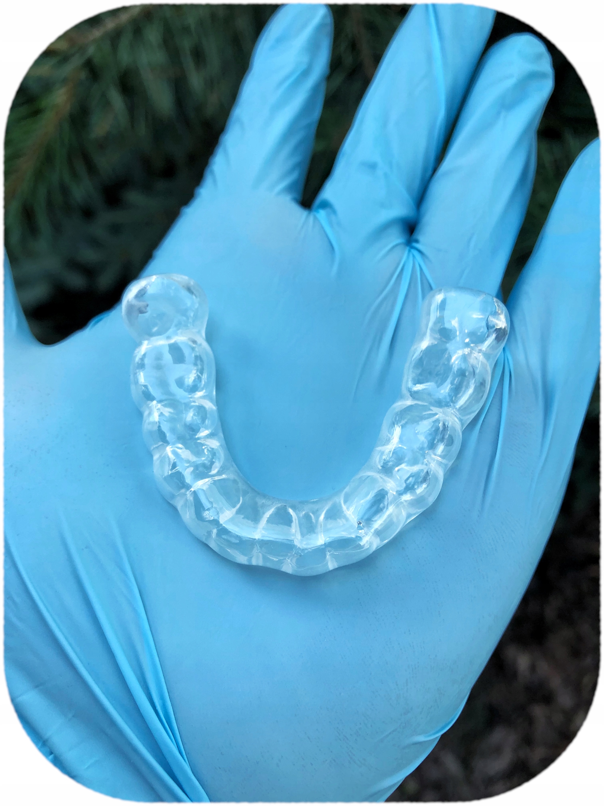 - Поверхня, що лежить на зубах, виготовлена з гумового матеріалу, а зовнішня сторона виготовлена з твердого стоматологічного матеріалу, який ефективно захищає від