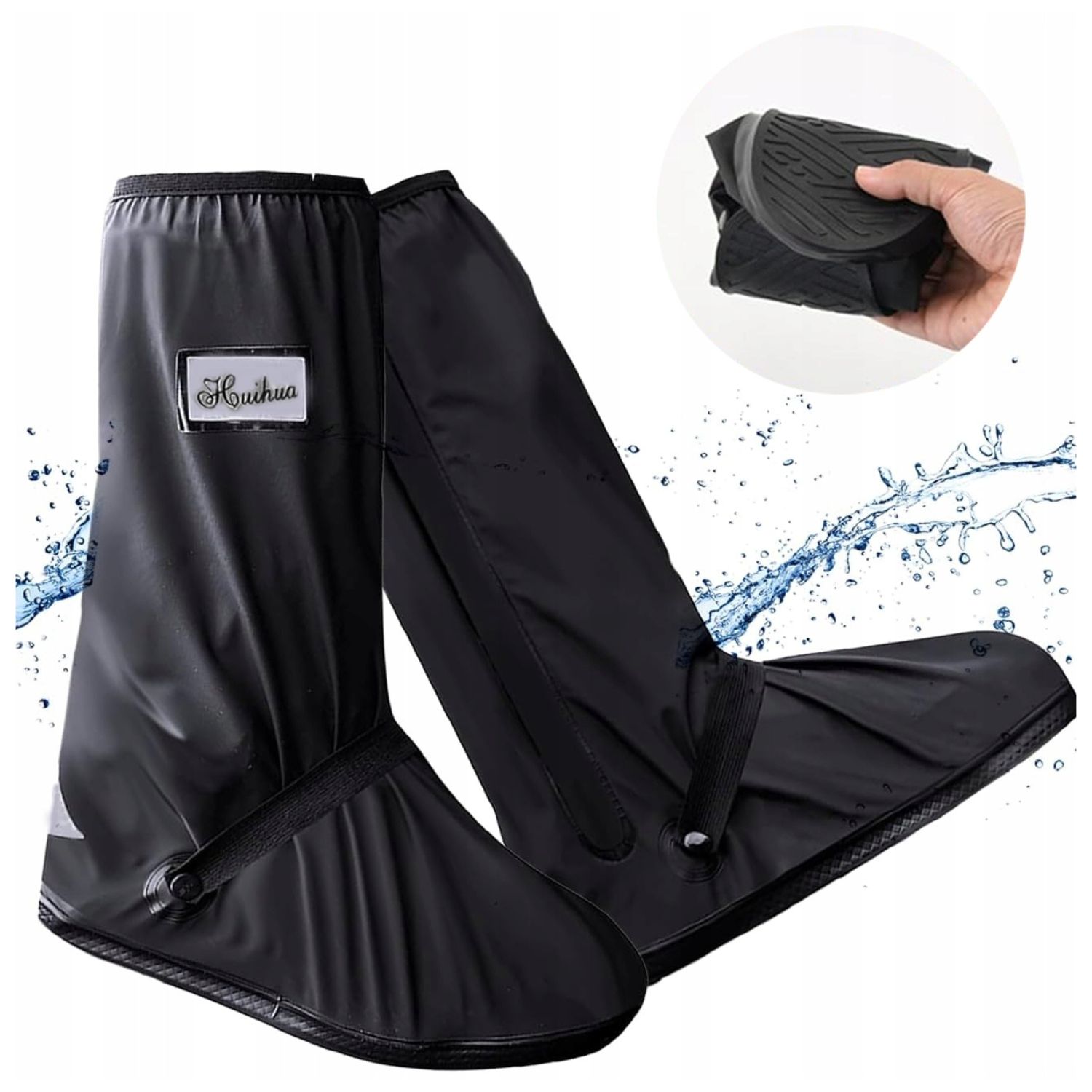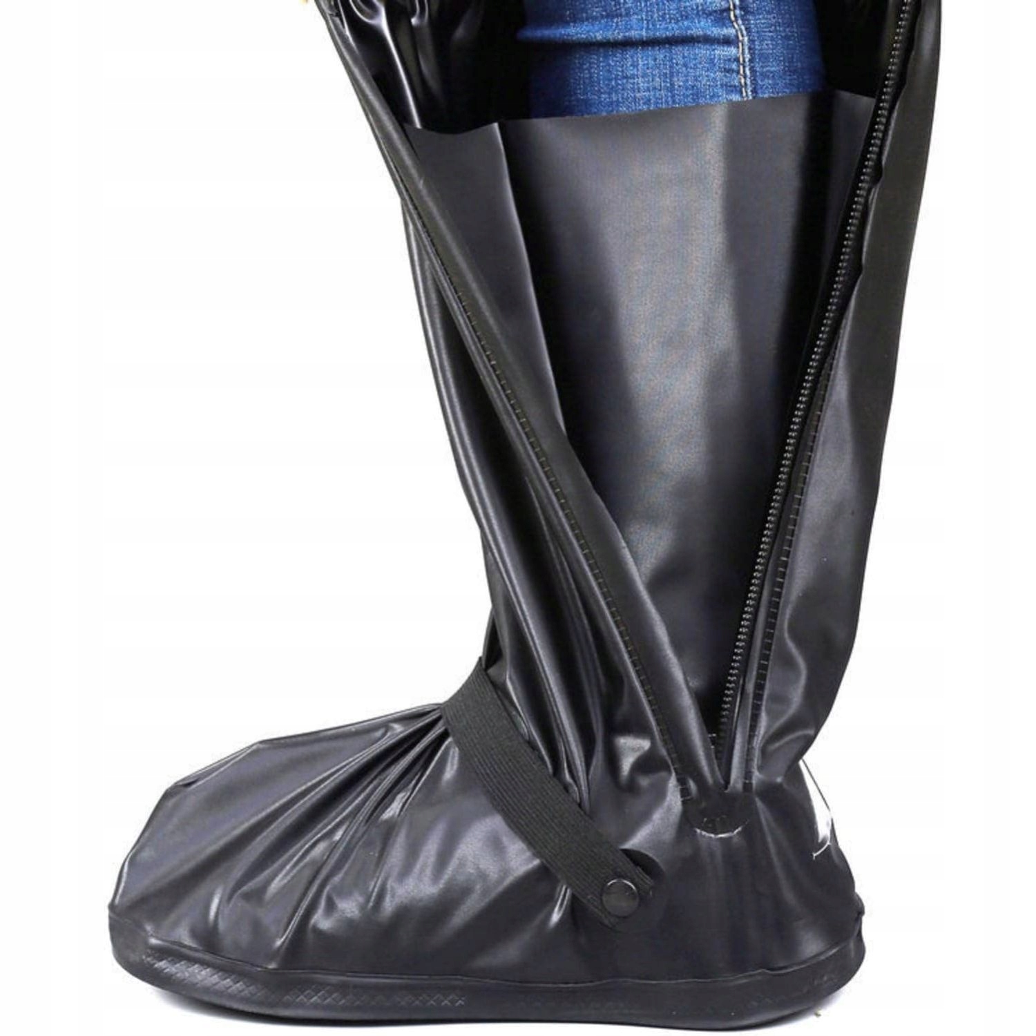 Еластичний верхній матеріал і застібки забезпечують зручну та нековзку посадку. Збоку протекторів є водонепроникна блискавка, яка полегшує їх надягання та зняття. Водонепроникна тканина, розміщена за блискавкою, забезпечує подвійний водонепроникний ефект. Посилена нековзна підошва з ПВХ гарантує міцне зчеплення з землею. Еластичний ремінь на щиколотці забезпечує більш ергономічну посадку. Світловідбиваючі позначки на литці та п’яті забезпечують більшу безпеку вночі.