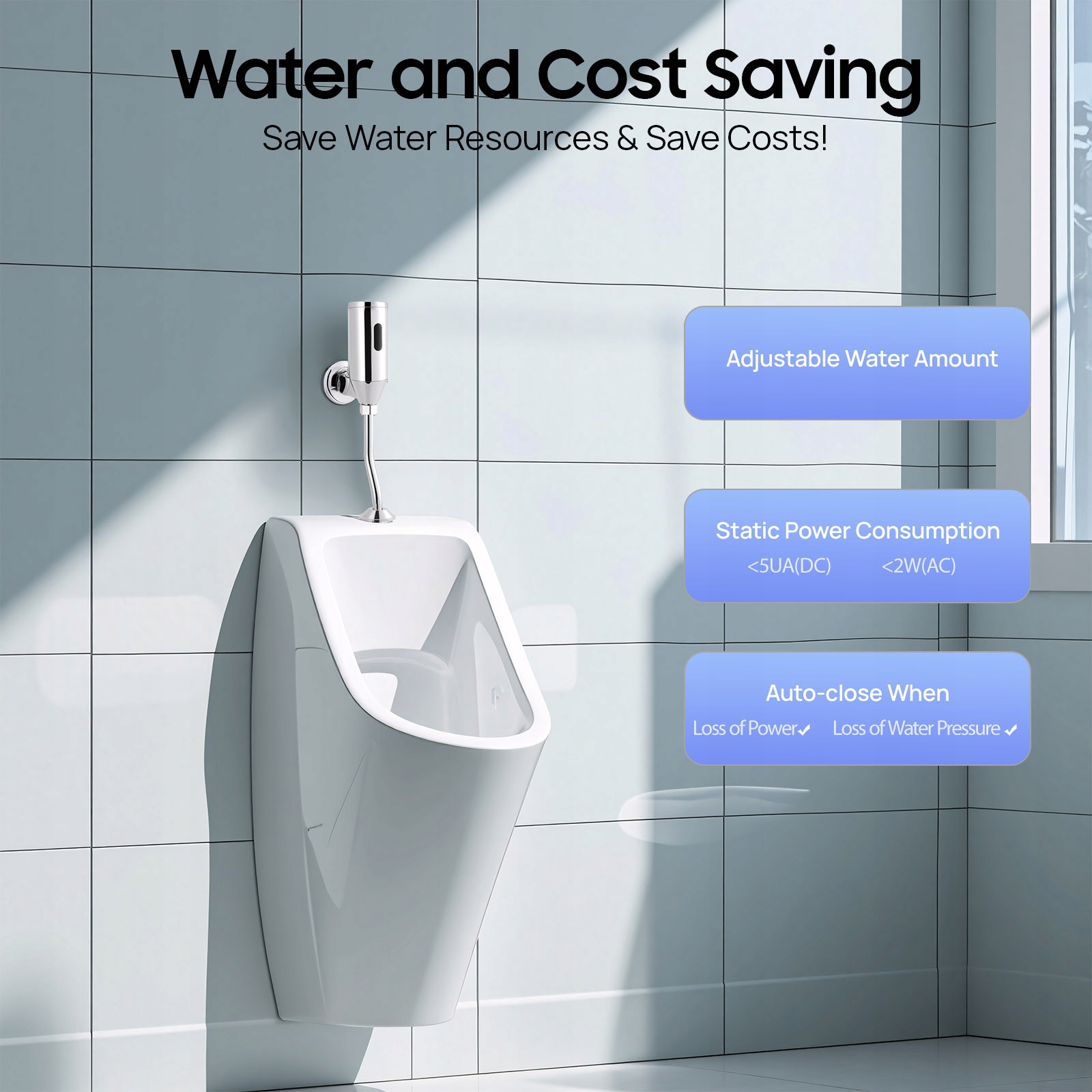 ✅✅Економія води та коштів: пристрій використовує двоступеневу система змиву, яка визначає потребу у воді за 3 секунди, потім змиває протягом 3 секунд, потім змиває протягом 4 секунд, коли хтось виходить з туалету. Кількість води можна регулювати. Статична споживана потужність < 5UA (постійний струм), < 2W (змінний струм). Клапан автоматично закривається, коли зникає подача електроенергії або тиск води, заощаджуючи водні ресурси та знижуючи витрати!