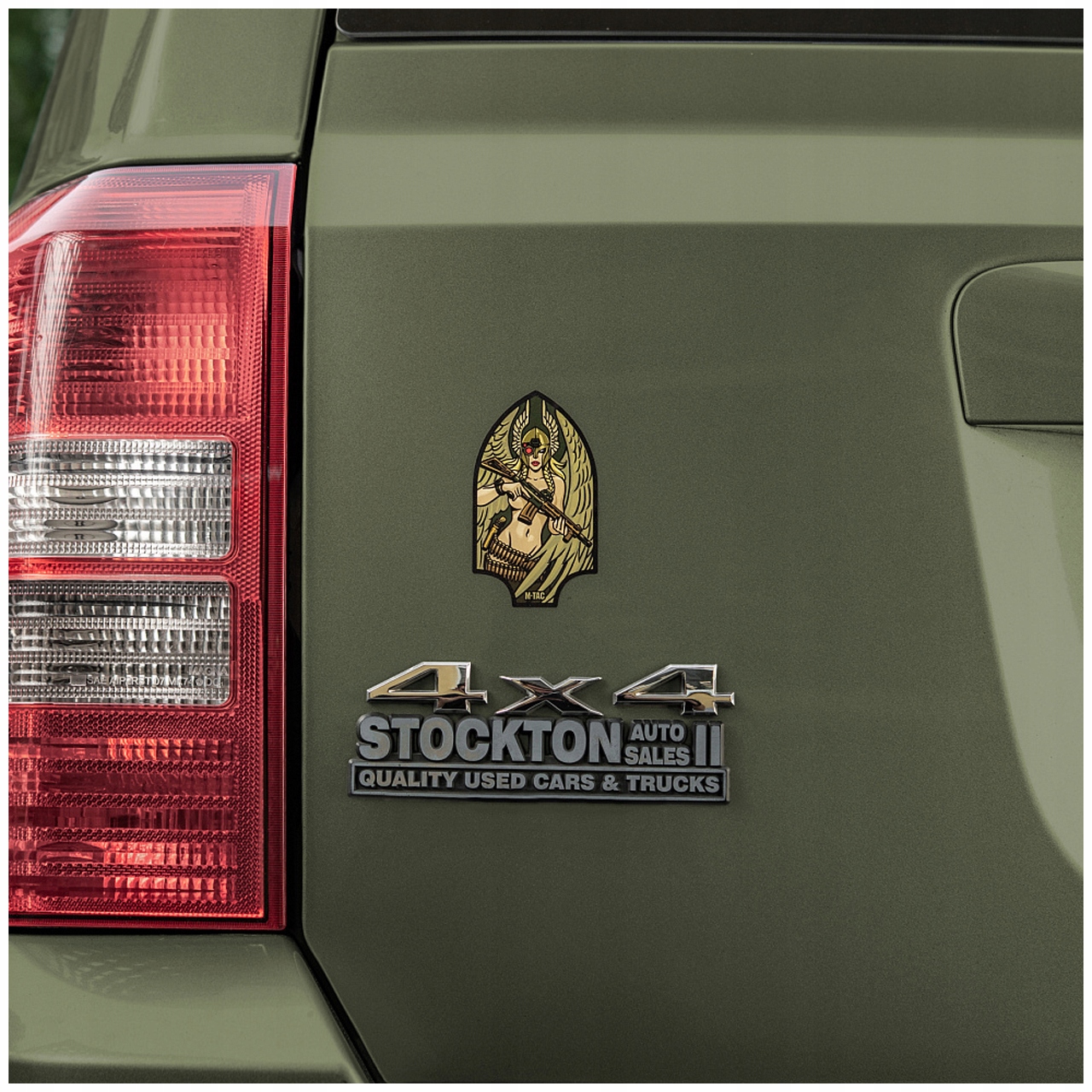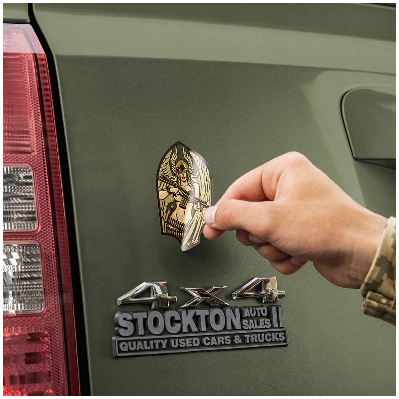 На наклейці ми бачимо модернізовану та рішучу Valkyrie у стилізованій норманській формі шолом і тримає в руках M4штурмову гвинтівку. Наклейка, виконана у формі відомої американо-канадської нашивки Arrowhead, яка є візитною карткою легендарного військового формування спецназу США (First Special Service Force), створеного під час Другої світової війни.