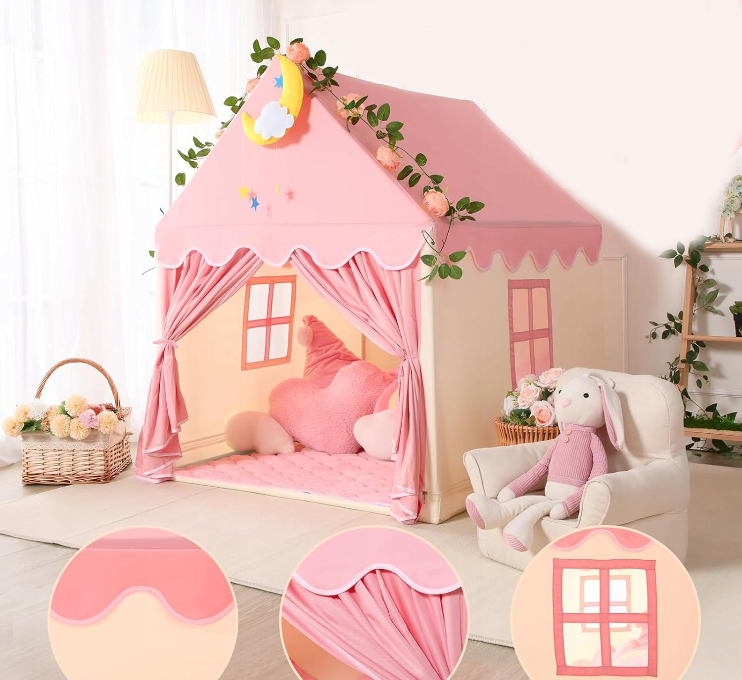 - МРІЯ КОЖНОЇ ДІВЧИНИ - намет для дітей - це чудова розвага протягом довгих годин. Тканинний дитячий намет у формі будиночка - подарунок мрії кожної дитини. Дитячий будиночок має 2вікна з дрібної сітки та зручний вхід. У ньому можна сховатися з улюбленими іграшками та дати волю своїй уяві. Дитячий палац стане ідеальним місцем для емоційної та творчої гри як вдома, так і на природі - напр. в саду, на пікніку, на терасі або на пляжі.