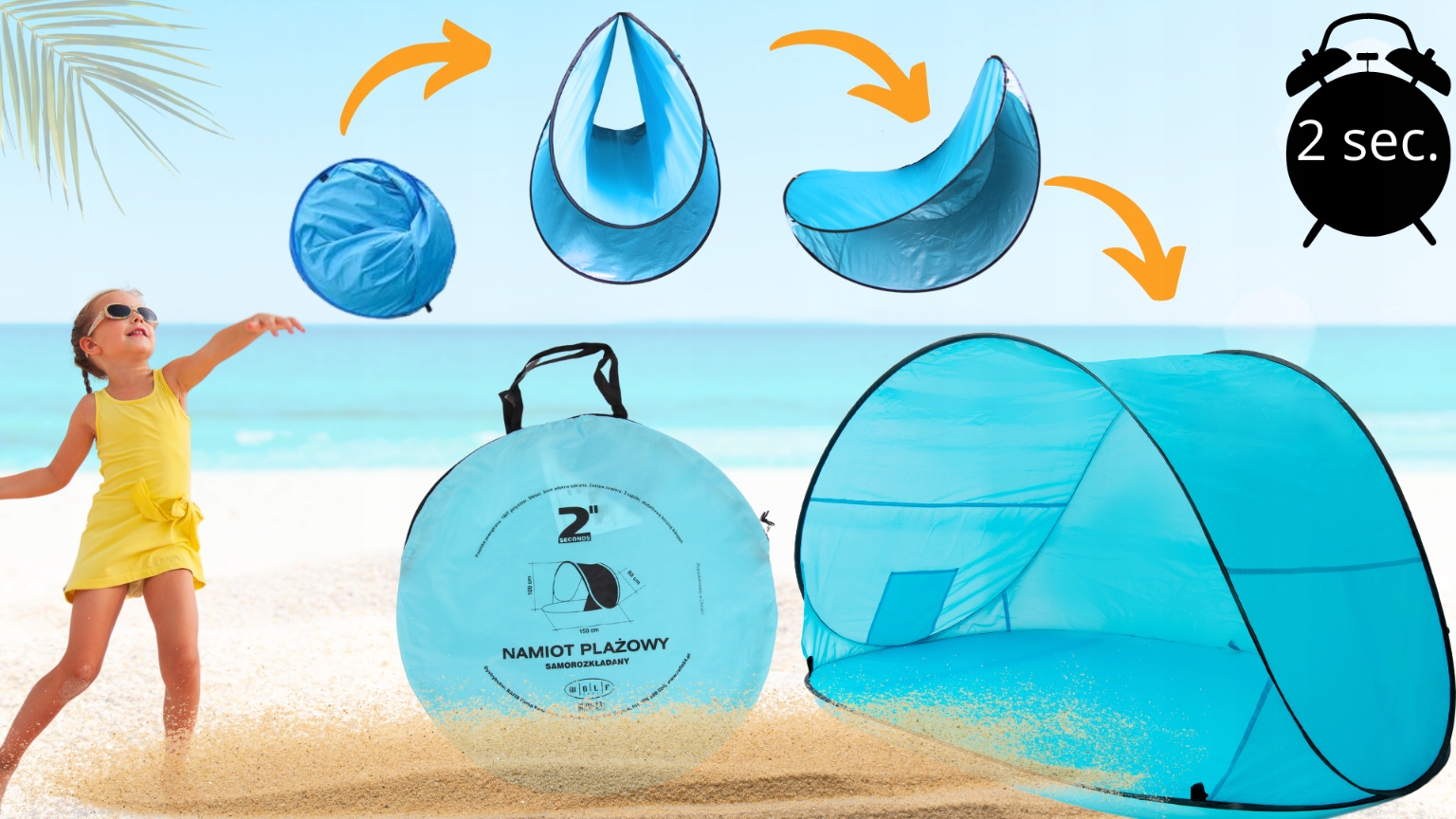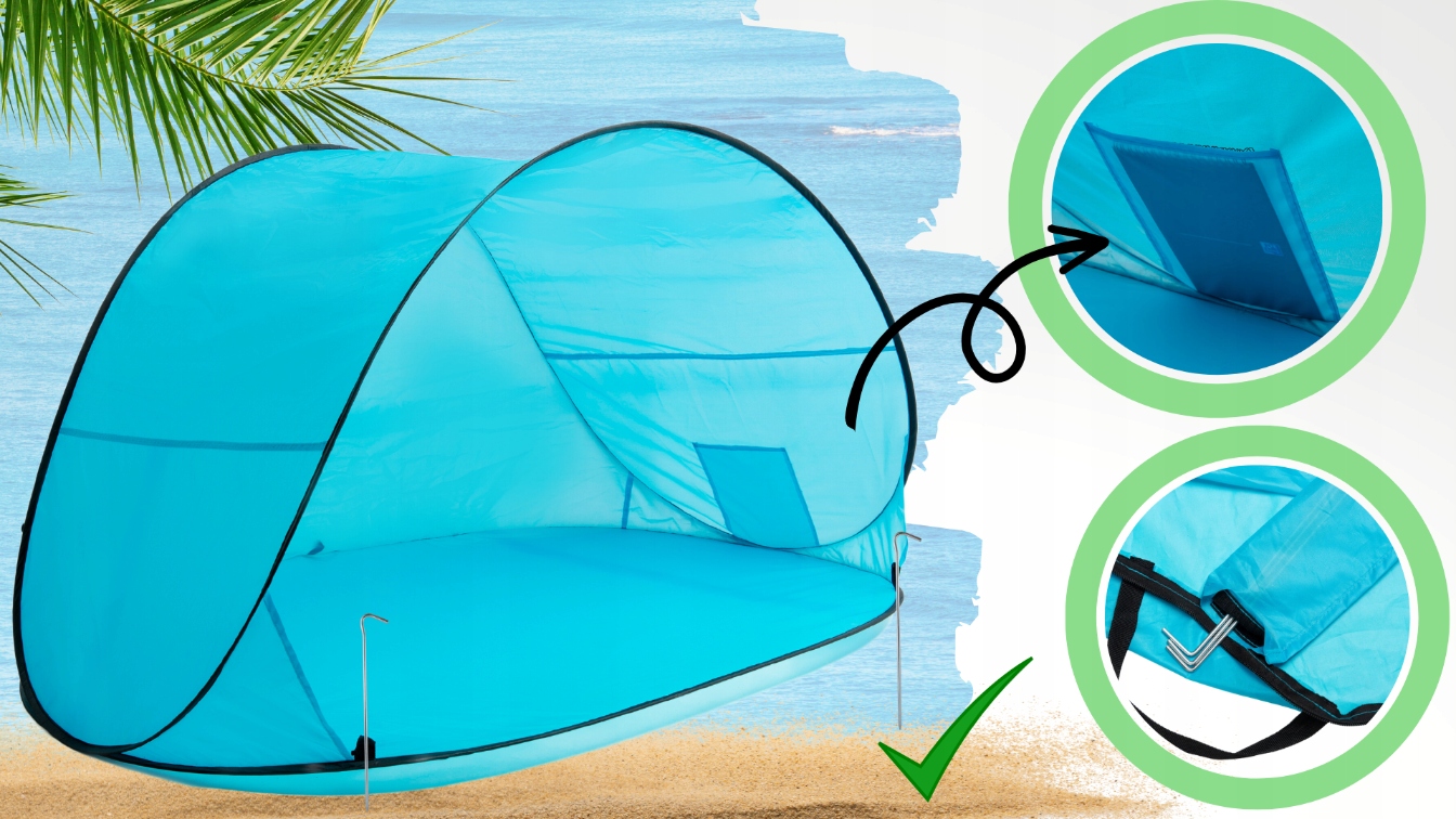 - ✅Це ідеальний спосіб безпечного відпочинку біля води, а також захист для дітей. Крім того, намет ізолює дно і захищає від вологи та холоду. Це обов'язковий елемент святкового інвентарю. Він ідеально підходить для відпочинку, подрімати або читання книги - створить тінь і не дасть очам втомитися від сонця.