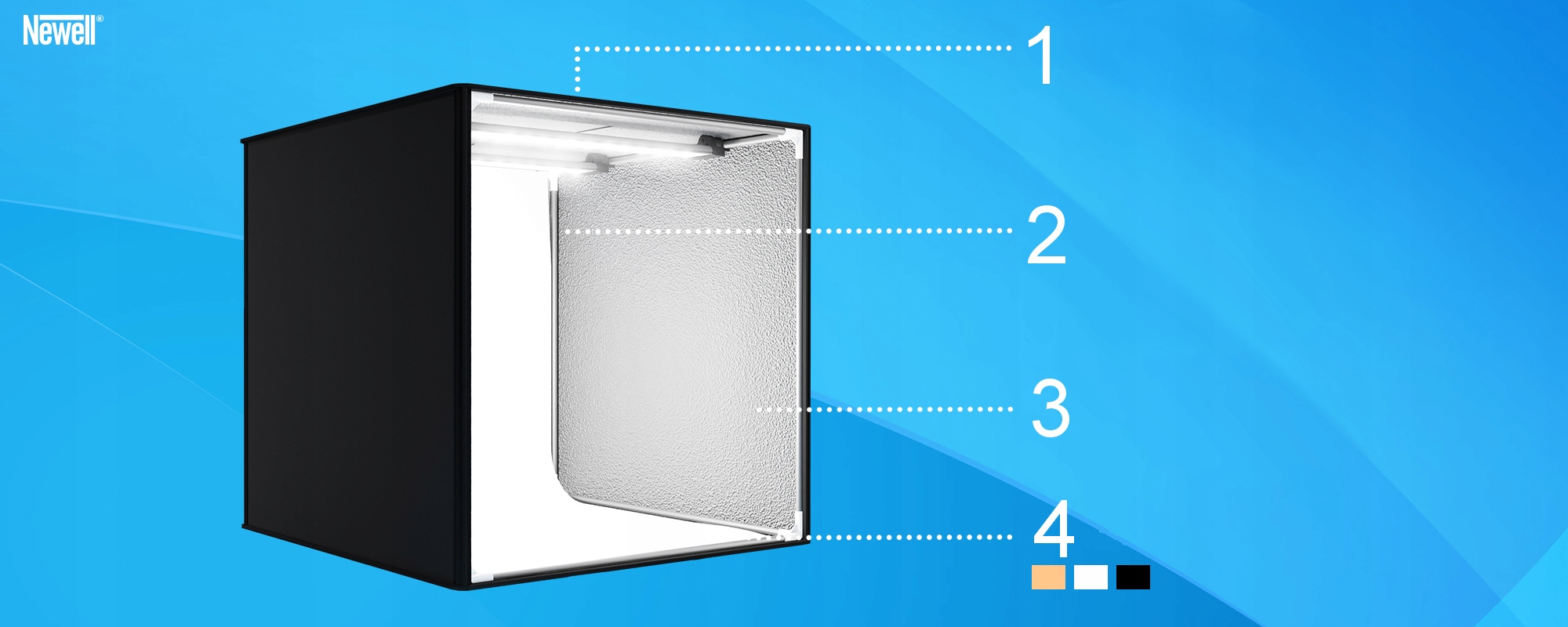 Набір містить три барвисті фони (білий, чорний і оранжевий). Вони дозволяють креативно оформити всю композицію в залежності від специфіки фотографованого виробу. Фони виготовлені з міцного пластику, стійкого до вологи та зминання. Безтіньовий намет Newell M80II має два «входи». Фотографії можна робити як зверху, так і збоку, прямо або під кутом. Верхнє вікно ідеально підходить для зйомки фотографій «з плоским лежанням». Композиція та можливості освітлення практично безмежні.