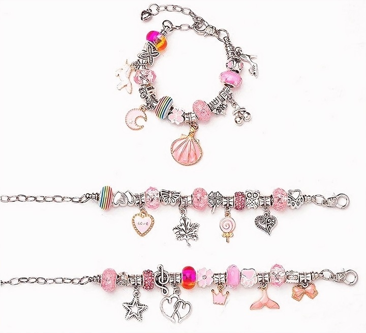 - ВЕЛИКИЙ НАБІР - набір із 64 елементів дозволить вашій дитині створювати неймовірно барвисті браслети різної форми та з різними мотивами. У набір 3 браслети з намистинами та підвісками.