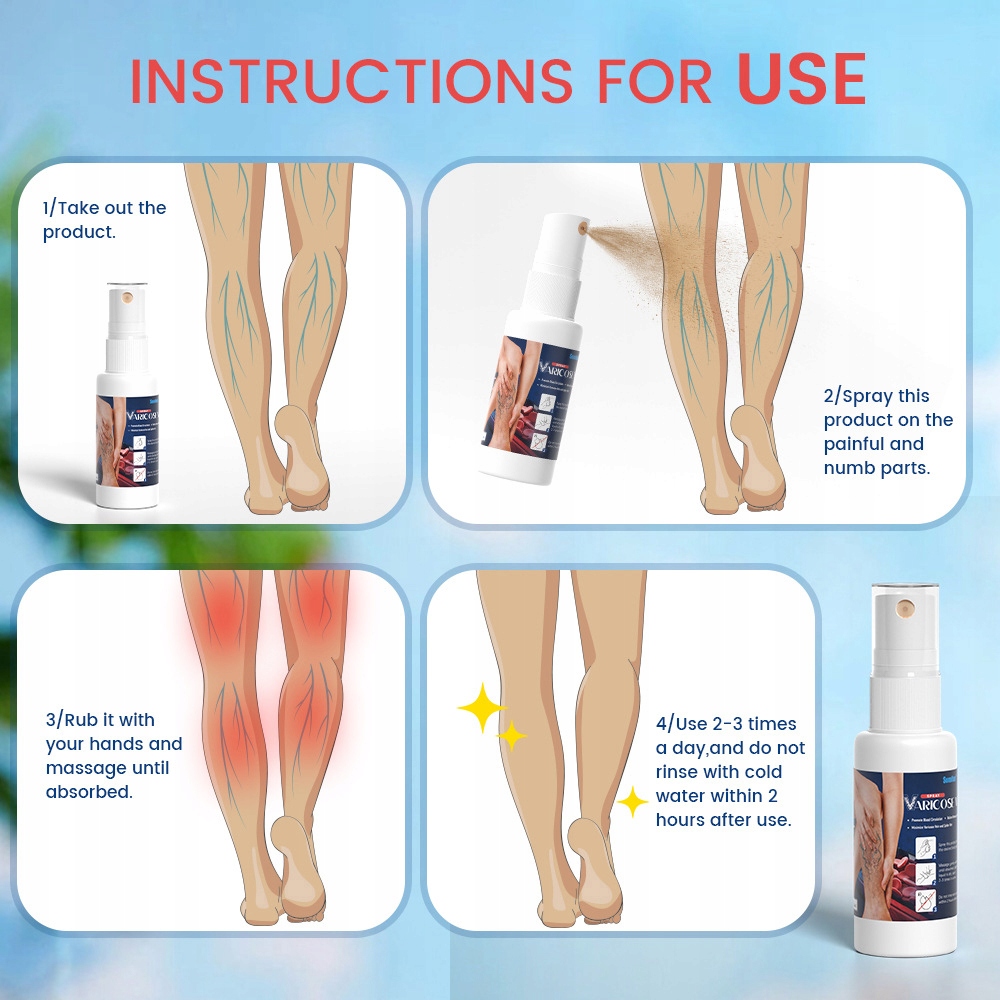① Нанесіть відповідну кількість гелю на литки, щиколотки або будь-які ділянки, які відчувають втому або набряки, і обережно масажуйте до повного вбирання.