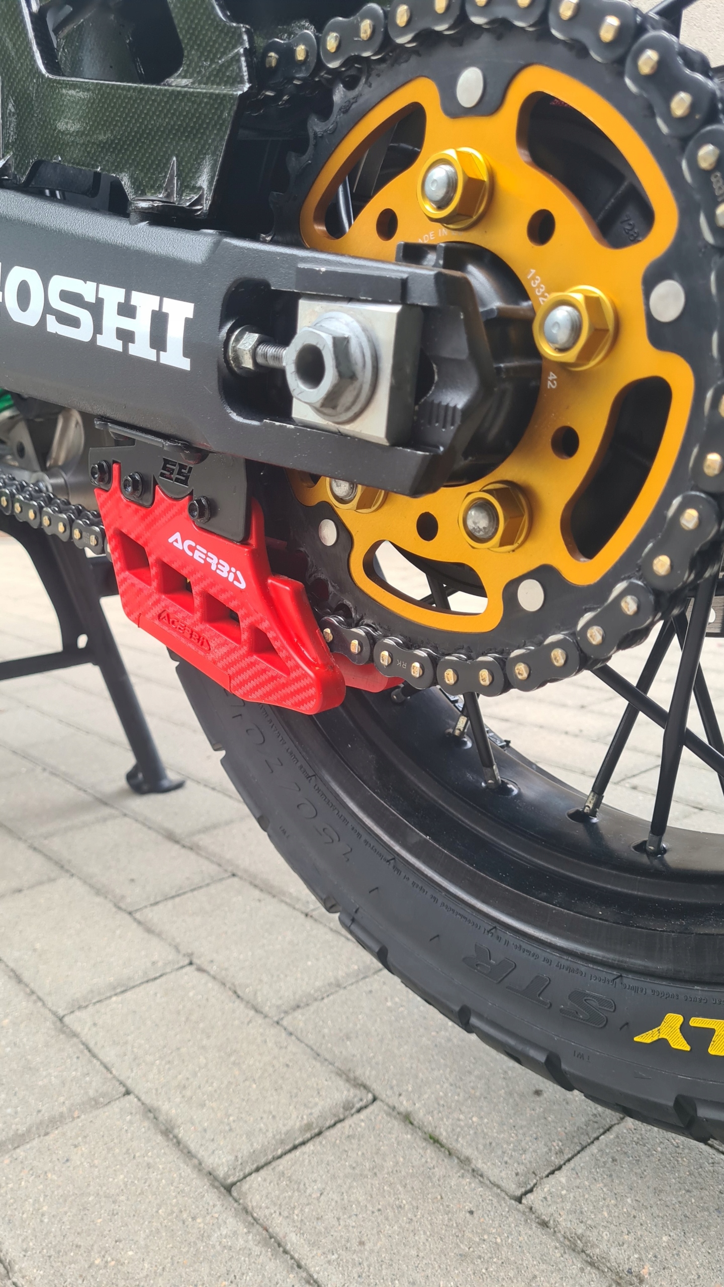 Повний комплект направляючих ланцюга. Установка не вимагає втручання в конструкцію мотоцикла, кріпиться на вже встановлену ланцюг завдяки тому, що нижня салазка є змінною деталлю. . Набір включає: