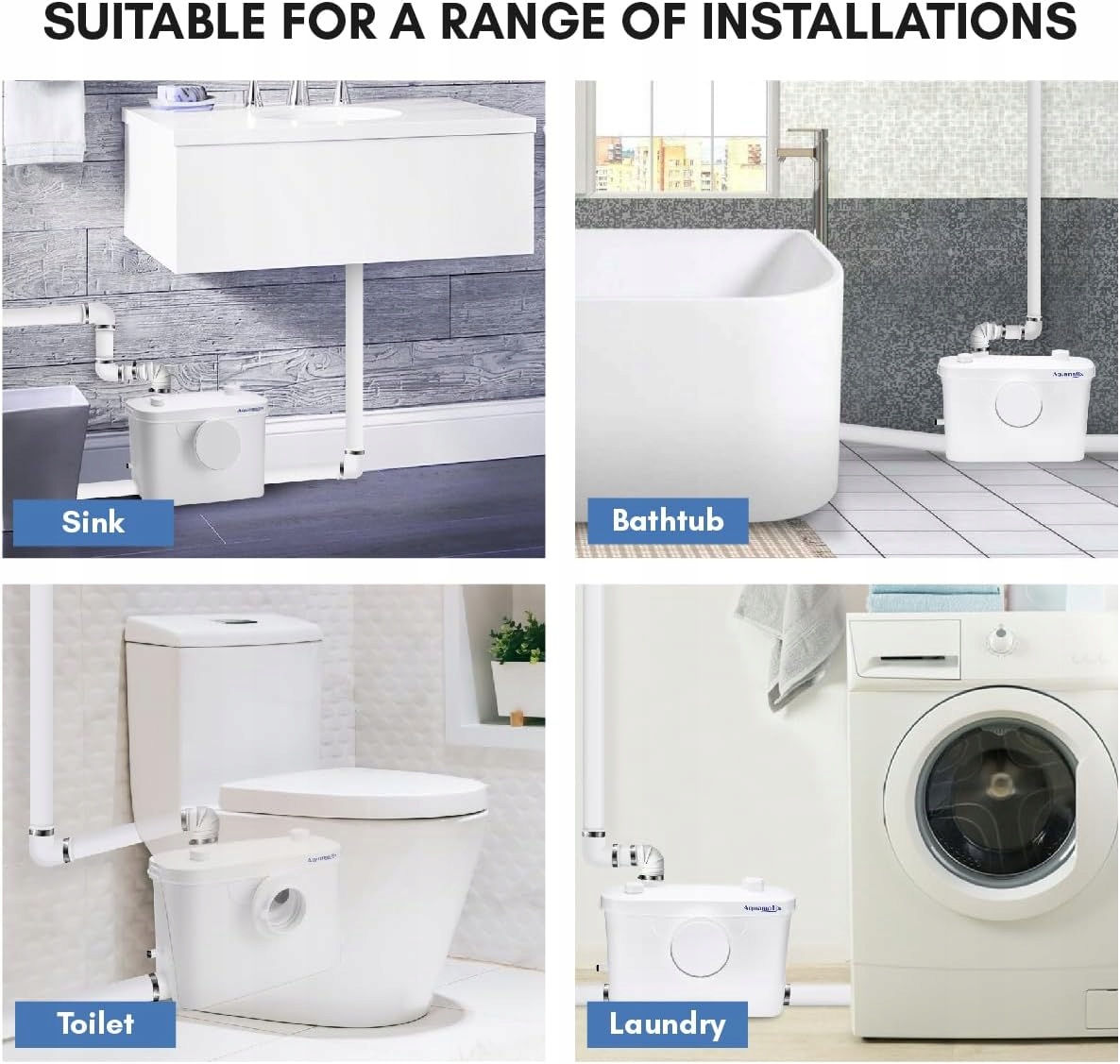 Він має вхід у туалет і дві точки входу, сумісні з унітазами, раковинами та душами. Це дозволяє легко підключати та направляти стоки безпосередньо з будь-якого джерела до насоса.