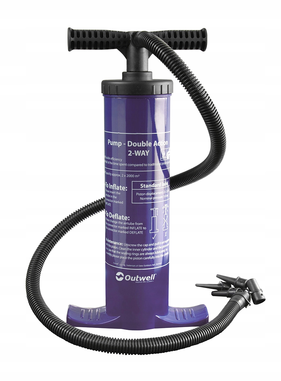 Насос Outwell Double Action Pump має об’єм 2 л. Модель використовується як для інфляції, так і для дефляції. Завдяки тому, що насос поставляється з трьома різними наконечниками (форсунками), ви можете використовувати його при обдуванні предметів з різними клапанами. Модель характеризується малою вагою та невеликими габаритами, що полегшує транспортування.