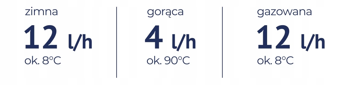 Midea JS1844T характеризується продуктивністю 12 л/год для холодної води (приблизно 8°C), а також для гарячої води (прибл. 90°C) 4 л/год і газованої (також прибл. 8°C) 12 л/год, що забезпечує постійний доступ до свіжої та освіжаючої води.