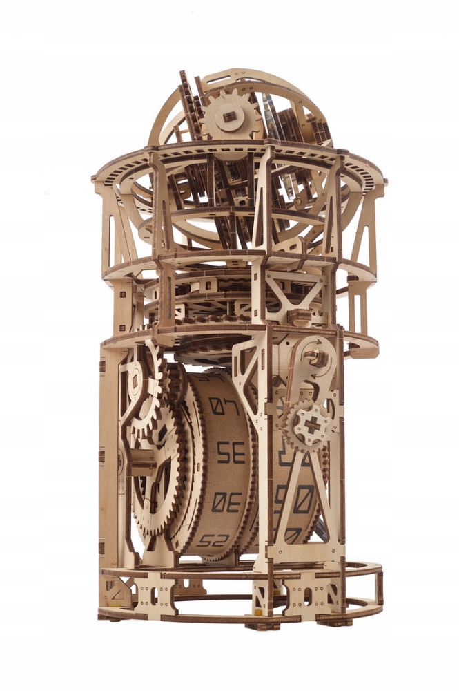 Заводна теорія Всесвіту, пропагована деїстами XVII століття, порівнює Землю та небо з величезним годинником, творцем якого є Бог. У контексті годинникарства Ugears створила функціональні дерев’яні моделі годинників, такі як gravity Aero Clock і пружинний Tourbillon. Створення цих годинників залучає користувачів до творчої пригоди, вимагаючи від них вирішення складних механічних завдань. Модель Sky Watcher Tourbillon має три осі обертання і працює за принципом накопичення потенціальної енергії в пружині, яка працює протягом 2-3 годин після заводу. Замість традиційного циферблата годинник використовує барабани для відображення часу. Sky Watcher Tourbillon присвячений любителям астрономії, годинникарства та DIY, поєднуючи чудовий дизайн із механікою.