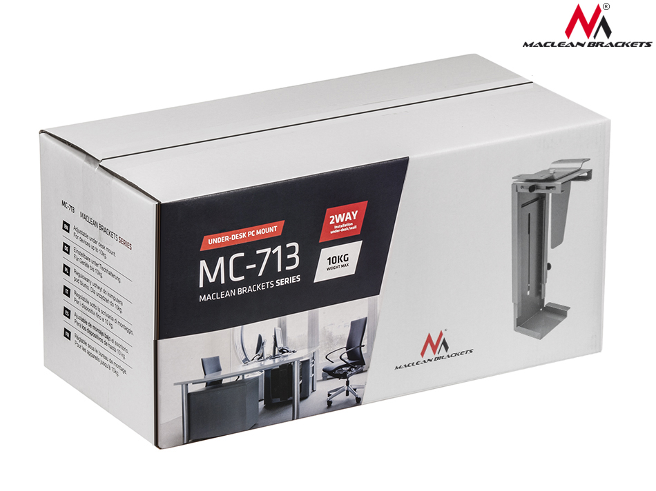 Кріплення, призначене для вертикального кріплення комп'ютера під столом. Це ідеальне рішення для оптимального використання робочого простору. Використання нашого тримача збільшує вільний простір на столі і в той же час тримає комп'ютер над підлогою, подалі від ніг, пилу та електростатичних зарядів. Найголовніше - комп'ютер завжди під рукою.