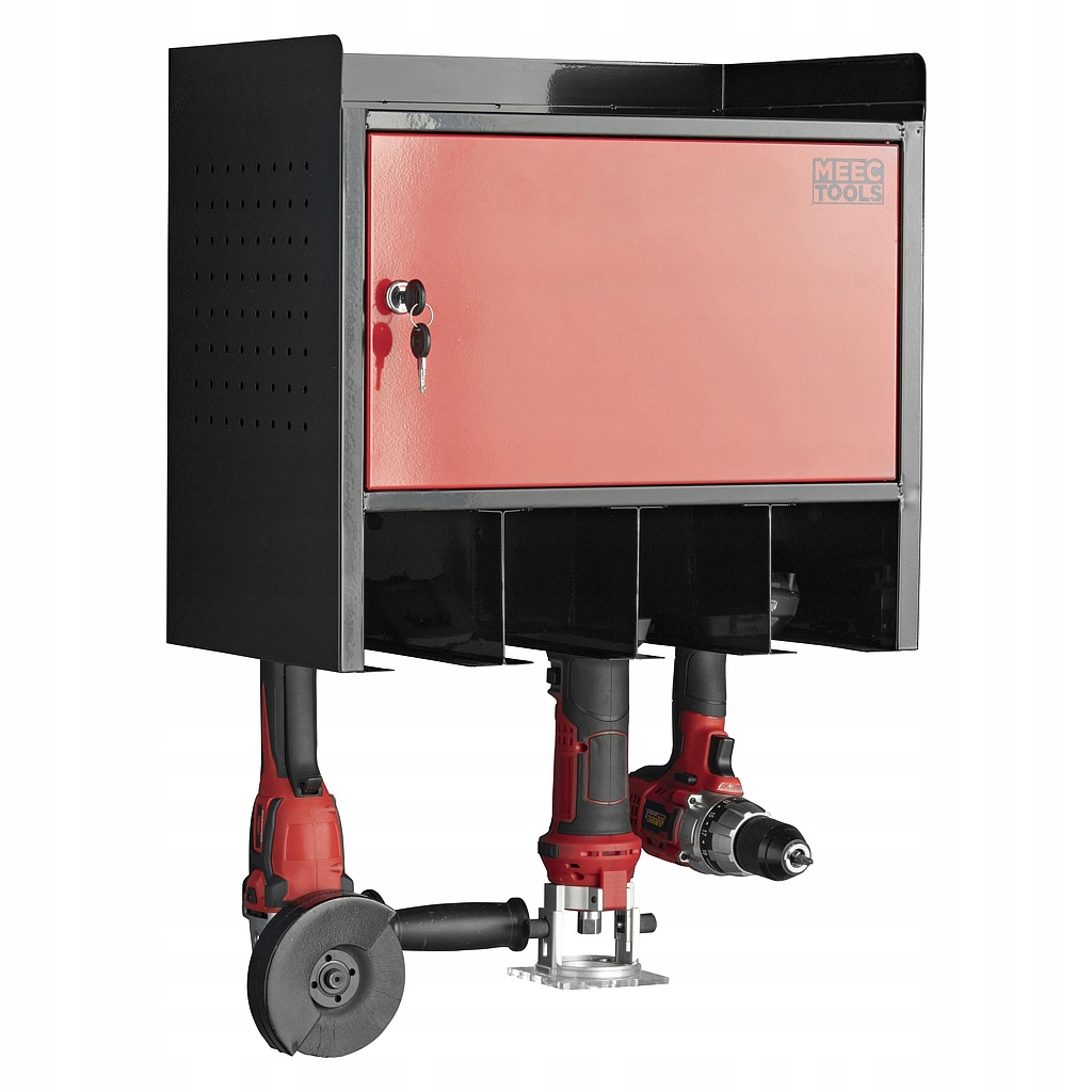 Інструменти та акумулятори валяються навколо гаража чи комори? За допомогою настінної шафи Meec Tools ви можете краще організувати та захистити чотири бездротові інструменти, акумулятори та зарядні пристрої – акуратний спосіб зберігання та економії місця!