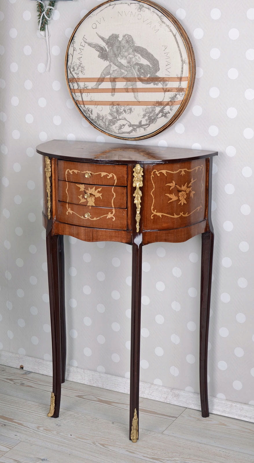 Маленький, чарівний бароко -комод, безсумнівно, буде прикрасою будь -якої кімнати. Тіло комода розташоване на чотирьох ніжних ногах з невеликою латньою декоративною фурнітурою і має три ящики з ніжними ручками. Горіховий дерев’яний бароковий комод з яскравішими контрастними в умовах. На продовженні передніх ніг комод має декоративну латунну арматуру, що дає їй незвичну чарівність. Меблі, які легко переносити та встановити, що сприяє належному розташуванню кімнати, де його можна знайти, хоча через форму, призначену для розміщення біля стіни. Ідеально підходить для вітальні або спальні, його також можна використовувати як зручний Гоан для різних дрібничок. Новий продукт, стилізований, готовий, надісланий повністю.