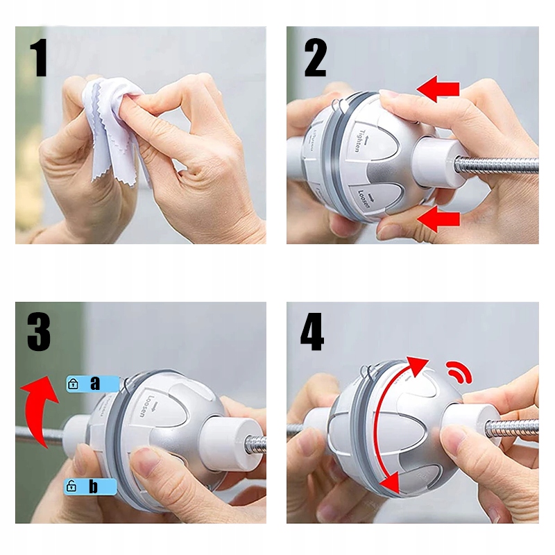 Дзеркало має міцне та гнучке наголів’я та наконечник, що обертається на 360°, що дозволяє вибрати ідеальне положення. Кріпильна ніжка дозволяє кріпити дзеркало до різних типів поверхонь завдяки присосці. Крім того, кнопка ON/OFF, розташована у верхній частині обода, зручна у використанні, не потребує контакту з дзеркальною поверхнею (тому не збирає відбитки пальців) і ідеально вписується в загальний вигляд виробу.