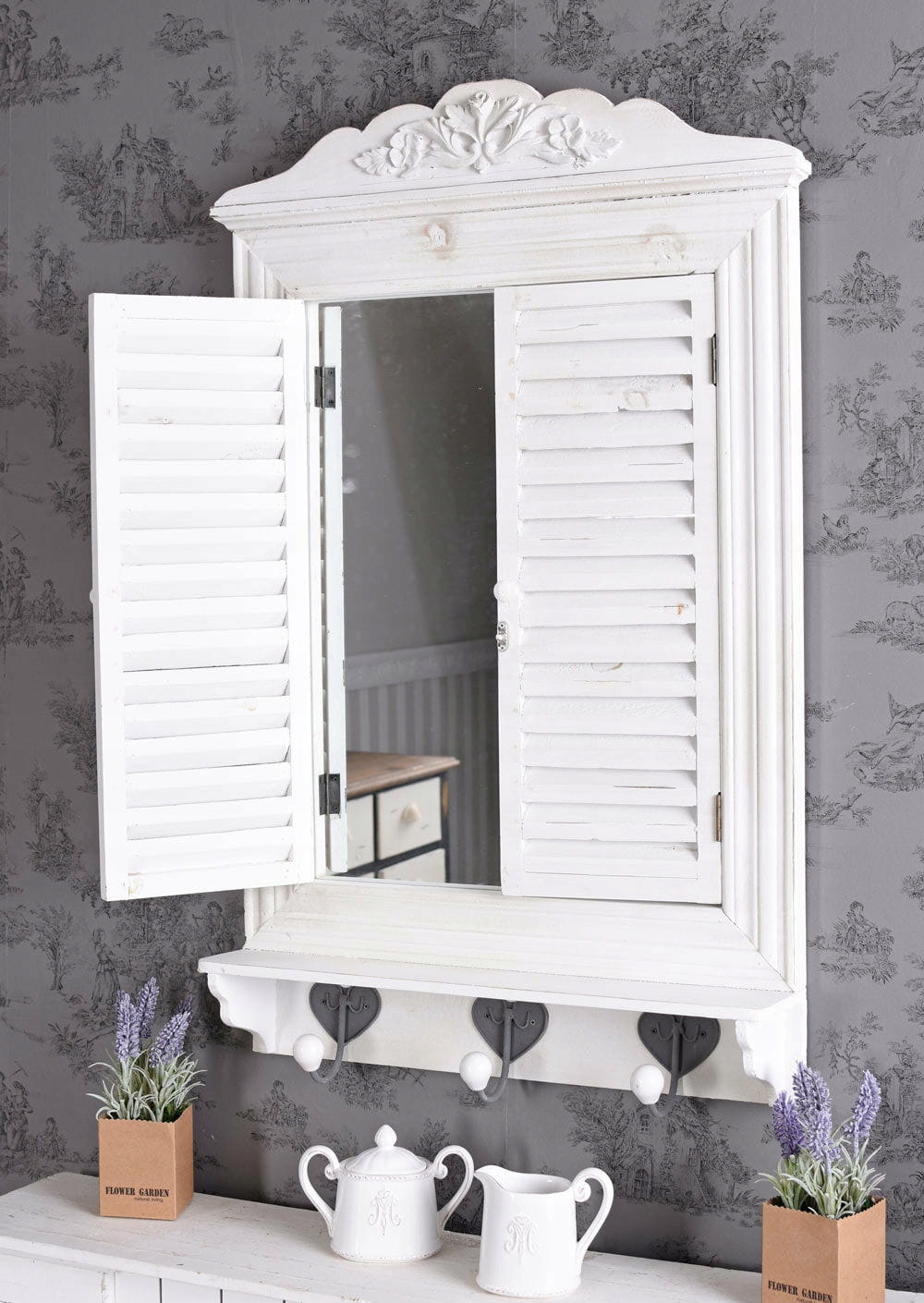 Дзеркало у формі віконниці виготовлено з натуральних матеріалів. Основною сировиною є натуральна деревина, яка додасть ідеального характеру будь-якому інтер'єру. Крім того, стилізовані металеві петлі та вішалки також надають незабутній стиль цьому елементу інтер’єру, який хоч і не дуже великий, але може багато чого змінити в нашому інтер’єрі.