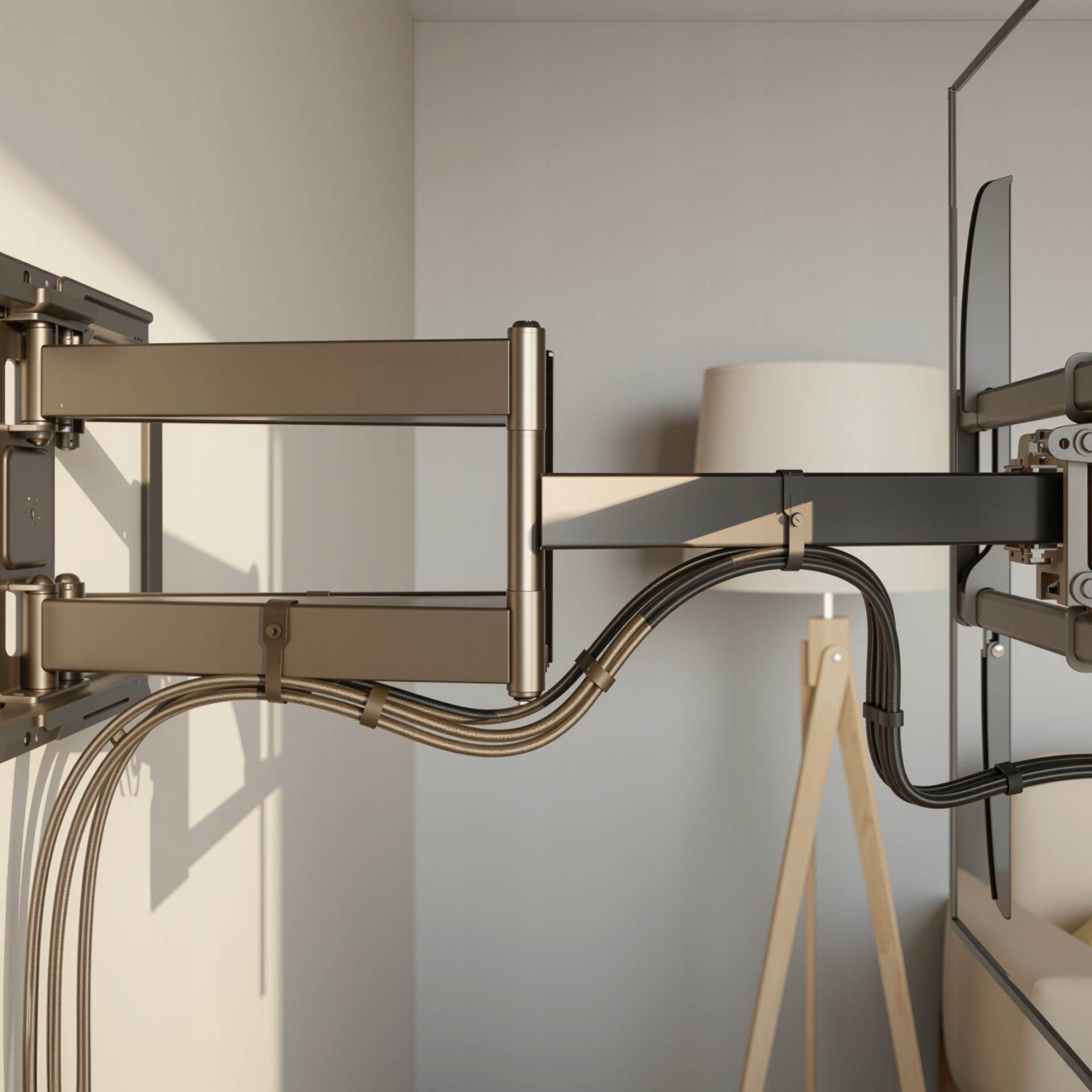 Завдяки інтегрованій системі прокладки кабелів і прикріпленим кабельним стяжкам вся установка виглядає естетично і акуратно. HDMI, кабелі живлення й аудіокабелі можна легко сховати вздовж кронштейна, зберігаючи чистий і безладний вигляд навколо телевізора.