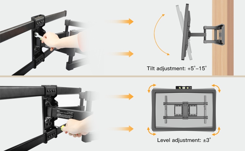 - Налаштуйте унікальні враження від переглядуЦе настінне кріплення для телевізора Ви можете нахил +5/-15°, поворот +/- 45° (максимальний кут повороту залежить від розміру телевізора) і налаштуйте рівень +/- 3° для максимальної гнучкості перегляду та відповідно до ваших потреб.< /li>