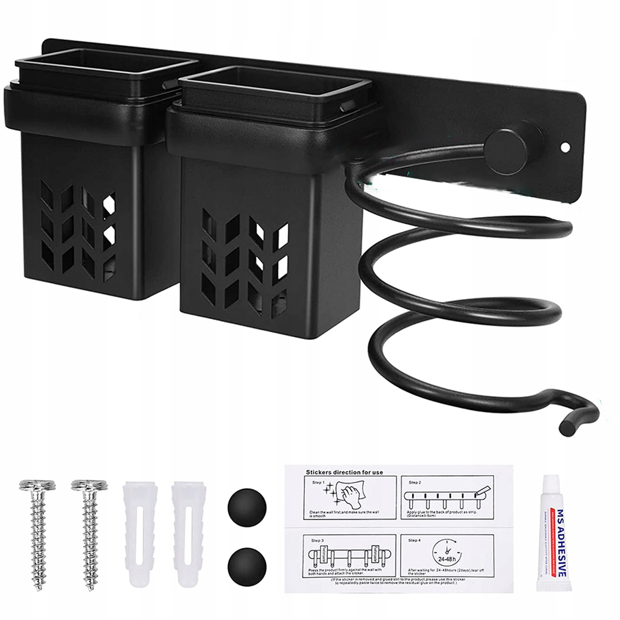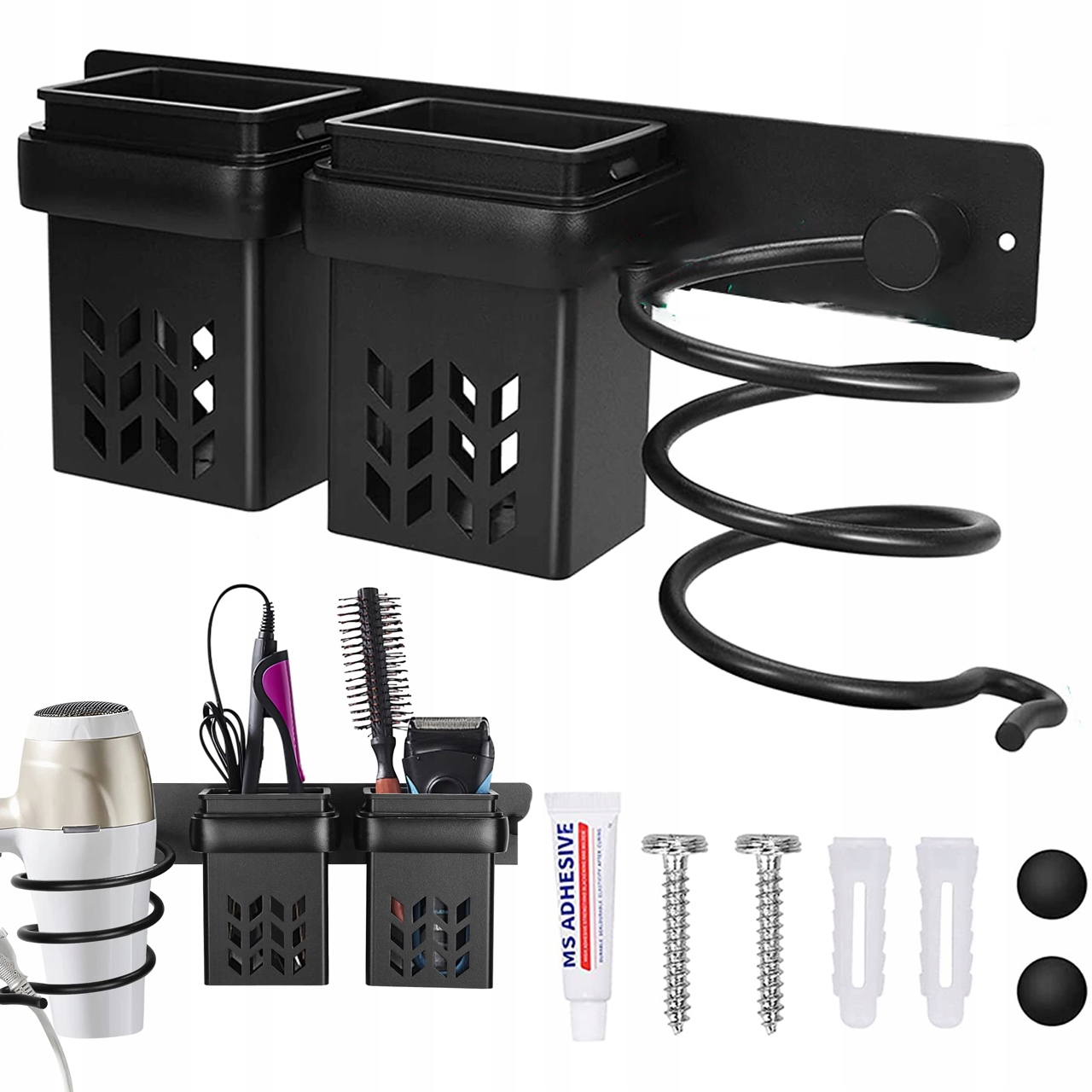 Спосіб встановлення 2:Органайзер для фена постачається з повним набором гвинтів, які кріпляться до стіни за допомогою отворів. Це на стіні. (Прихована кришка має отвори для гвинтів для покращення загальної естетики.)