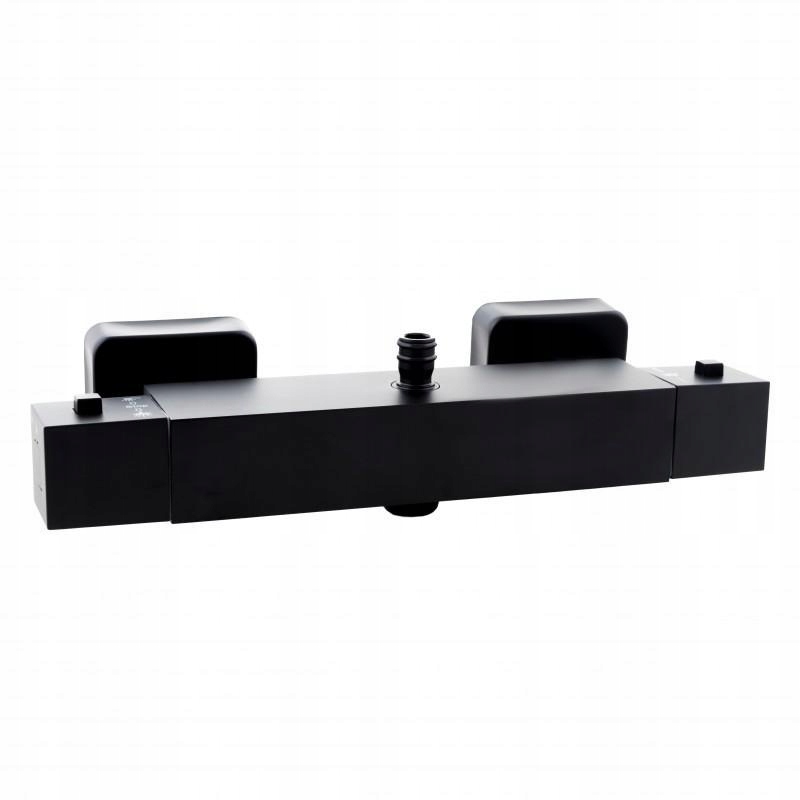 Термостатичний настінний змішувач для душа чорного. Виготовлена з високоякісної латуні. Змішувач з функцією точного налаштування температури гарантує високий комфорт і безпеку користування душем. Має замок для гарячоїводи при 38°C. У набір входять усі елементи, необхідні для складання