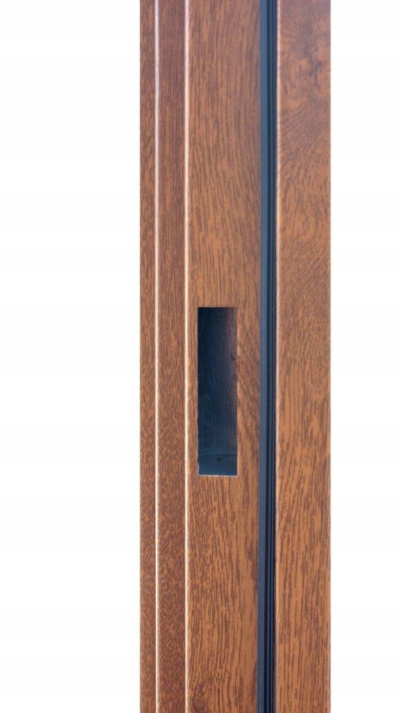 Двері мають товщину 50 мм і виготовлені зі сталевого листа, покритого декоративною плівкою зі структурою і кольором дерева, стійкою до УФ-випромінювання.