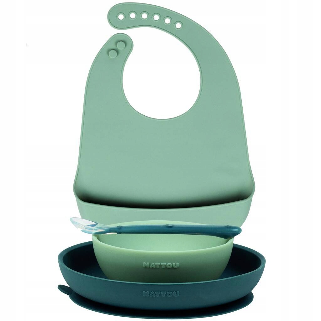 Набір силіконового посуду Nattou з чотирьох предметів з нагрудником з м'якого силікону дуже практичний, посуд зручно тримати в руках і не ковзає. У набір входить тарілка і миска з присоскою, ложка і нагрудник красивих, модних кольорів. Заокруглені внутрішні краї миски та тарілки полегшують прийом їжі дітьми та їхніми батьками. Ложка ідеально підходить для маленьких ручок і рота немовлят і маленьких дітей, що робить її ідеальним компаньйоном під час годування та навчання самостійності. З силіконовим нагрудником малюки можуть їсти, не забруднившись, і насолоджуватися компанією один одного з батьками. Нагрудник легко надягає і регулюється до 6 різних розмірів. Він ідеально підходить і дуже зручний завдяки м’якому матеріалу.