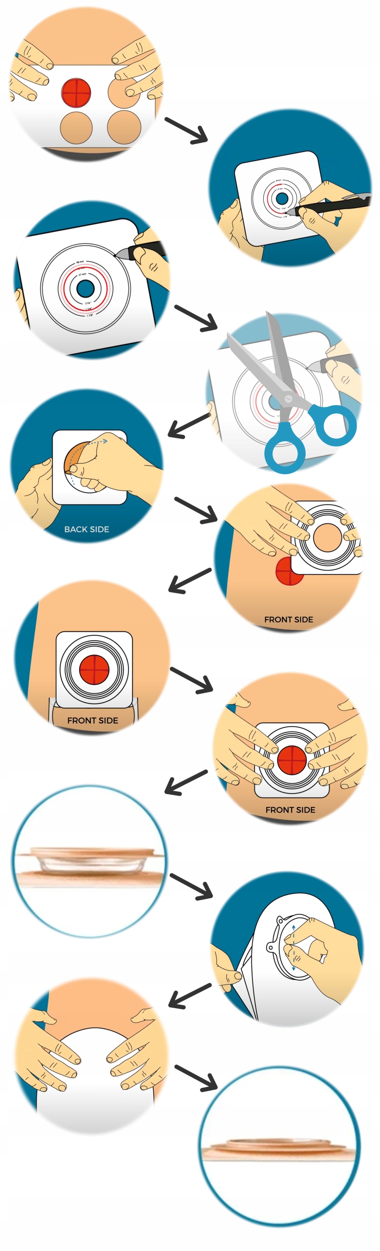 , що з'єднує плитку з сумкою для засувки. Перевага полягає в тому, що плитку можна навіть приклеїти до шкіри протягом декількох днів, а щоденну заміну слід піддавати лише мішку з остомії.