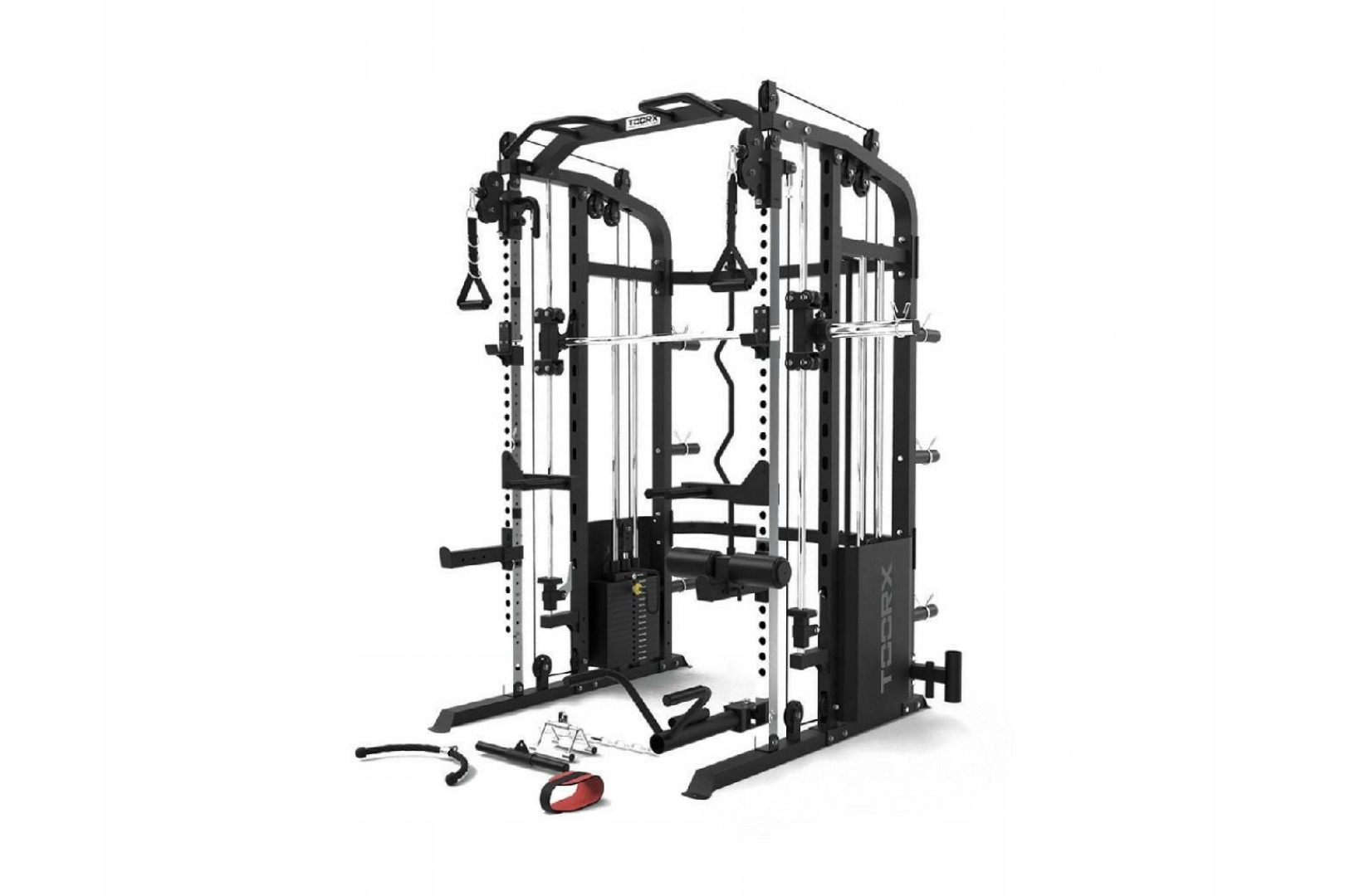- 3-В-1 ДОДАТКИ: подвійний екстрактор, Сміт-машина, стелаж. 2 коротких тримача для штанги (J-подібні гаки), 2 довгі фіксатори з підтримкою для ніг, штанга для підтягувань, поручні для віджимань, тримач для зберігання штанги, 6 тримачів для вантажу ø50 мм, 8 затискачів ø49 мм. Аксесуари: ремінь для щиколотки, мотузка, міна, 2 Y-подібні ручки, V-подібна ручка, коротка пряма планка, пряма та ламана планка.