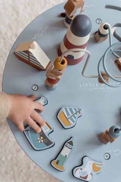 Цей дерев'яний багатофункціональний стіл від Little Dutch - справжній виклик для вашої дитини. Кожен із запропонованих видів діяльності сприяє розвитку моторики. Завдяки безпечній і збалансованій конструкції стіл заохочує до гри, вправляння вставати і тримати рівновагу. Стіл витриманий в блакитних тонах і оформлений в тематиці колекції Sailors Bay, він стане чудовим доповненням до інших товарів колекції Sailors Bay. Фантастична ідея подарунка. Стіл упакований в картонну коробку.