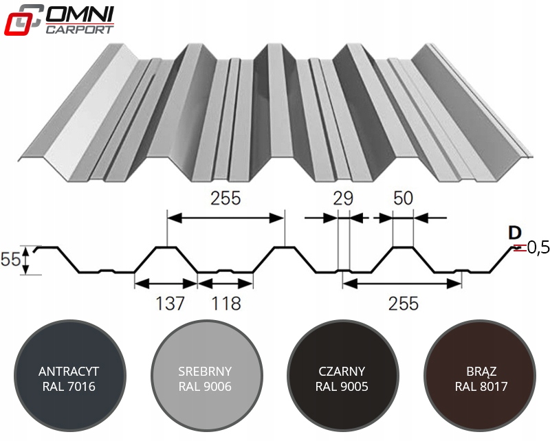 - Покриття даху: оцинкований трапецієподібний лист Т55, товщиною 0,5 мм, без антиконденсатного покриття з внутрішньої сторони. Доступний зовнішній колір: АНТРАЦИТОВИЙ RAL 7016, КОРИЧНЕВИЙ RAL 8017, СРІБЛИВИЙ RAL 9006, ЧОРНИЙ RAL 9005. Внутрішній колір: сіро-брудний, Можливість використання антиконденсатного покриття (ОПЦІЙНО).