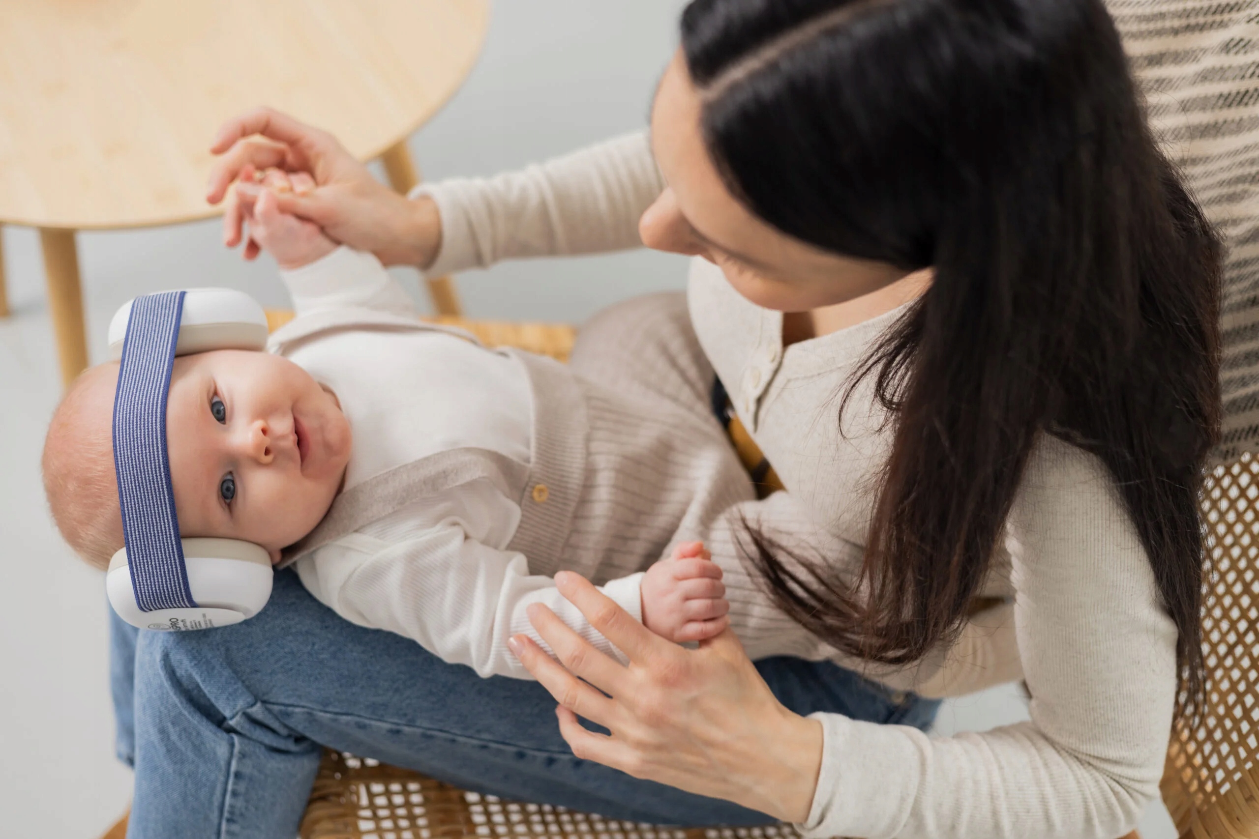 Амбушури оснащені м'якими подушечками з піною, які адаптуються до вух дитини. Виготовлені з гіпоалергенних матеріалів, дружніх до шкіри малюка. Усе це тримається на місці за допомогою еластичної стрічки, яка дозволяє зручно підлаштовуватися під форму та розмір голови малюка - без ризику зсуву чи тиску.