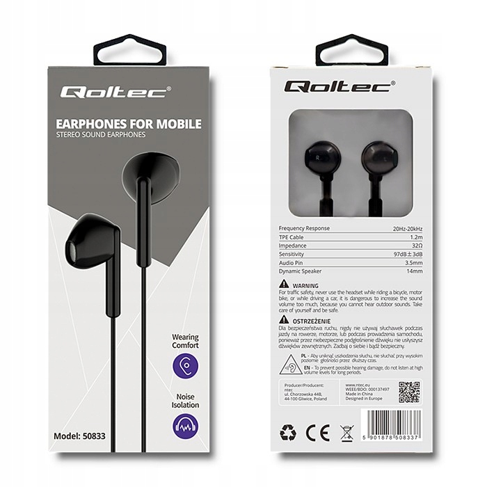 Високоякісні дротові навушники-вкладиші від Qoltec мають функцію шумозаглушення, що дозволяє повністю розслабитися під музику. Працюють з будь-якими пристроями з роз'ємом mini jack 3,5 мм. Кабель довжиною 1,2 м дозволяє легко тримати пристрій підключеним до навушників у кишені чи сумочці. Додатковою перевагою є вбудований мікрофон, який дозволяє часто спілкуватися, не дістаючи смартфон з кишені. За допомогою кнопки, розташованої поруч із мікрофоном, ви можете відповідати на виклик і завершувати його, а також керувати відтворенням музики, аудіокниг тощо.