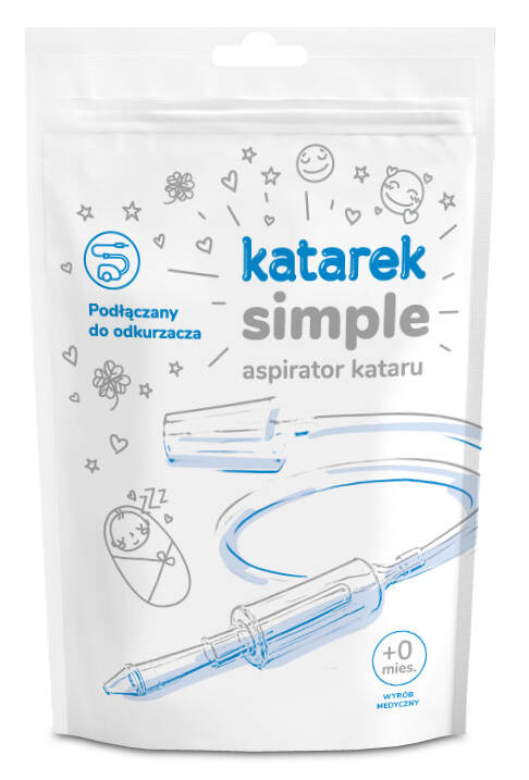 Аспіратор Katarek Simple підключається до пилососа, завдяки чому він використовує рівномірну та потужну силу всмоктування, створювану пилососом. Ця унікальна функція дозволяє ефективно «прибрати» нежить навіть з глибоких відділів носа дитини. Аспіратор має однорідну незнімну камеру з резервуаром для секрету та редуктором сили всмоктування, що забезпечує безпеку та м’якість під час використання.