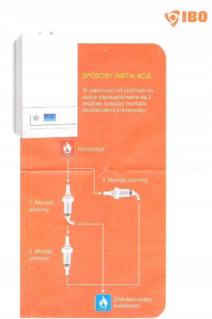 Нейтралізатор конденсату IBO ефективно нейтралізує конденсат (так званий конденсат, тобто конденсат водяної пари в поєднанні з продуктами згоряння палива в котлі).