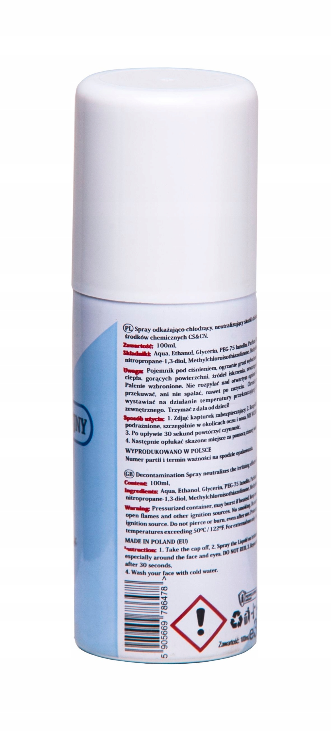 Дезінфікуючий та охолоджуючий спрей, який нейтралізує дію перцевого балончикаOC, сльозогінного газу CS та CN та інших дратівливих хімікатів. Приносить негайне полегшення.