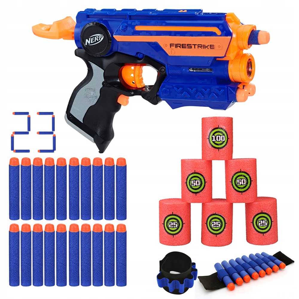 Цей набір поєднує в собі чудовий пусковий пристрій із чудовими аксесуарами. Наводьте Firestrike на пінопластові мішені, вмикайте лазер і стріляйте! На додаток до мішеней ми отримуємо величезний запас дротиків і еластичну стрічку на 8 дротиків, завдяки якій ми можемо швидко заповнити прогалини в магазині.