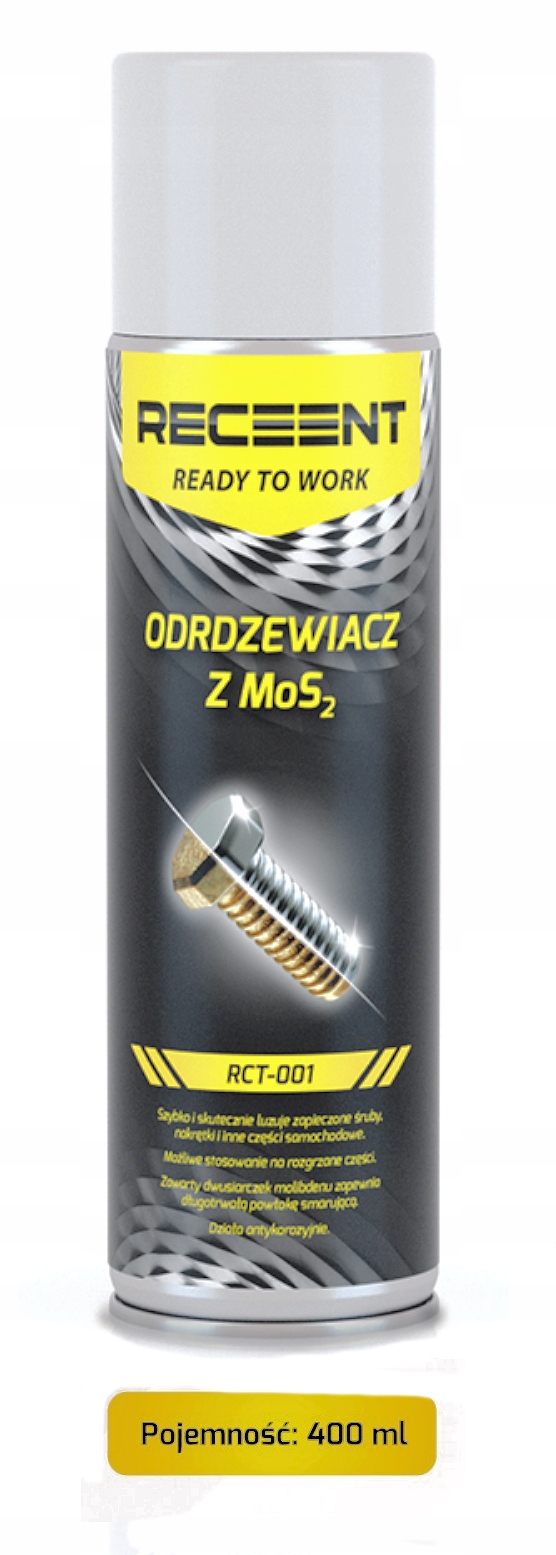 RECEENT RCT-001 - проникаюча речовина з додаванням дисульфіду молібдену, призначена для видалення іржі та змащування. Швидко та ефективно відкручує застряглі гвинти, гайки та інші деталі автомобіля. Ідеально проникає в корозійні з'єднання, розчиняє іржу і покриває їх мастильним шаром.