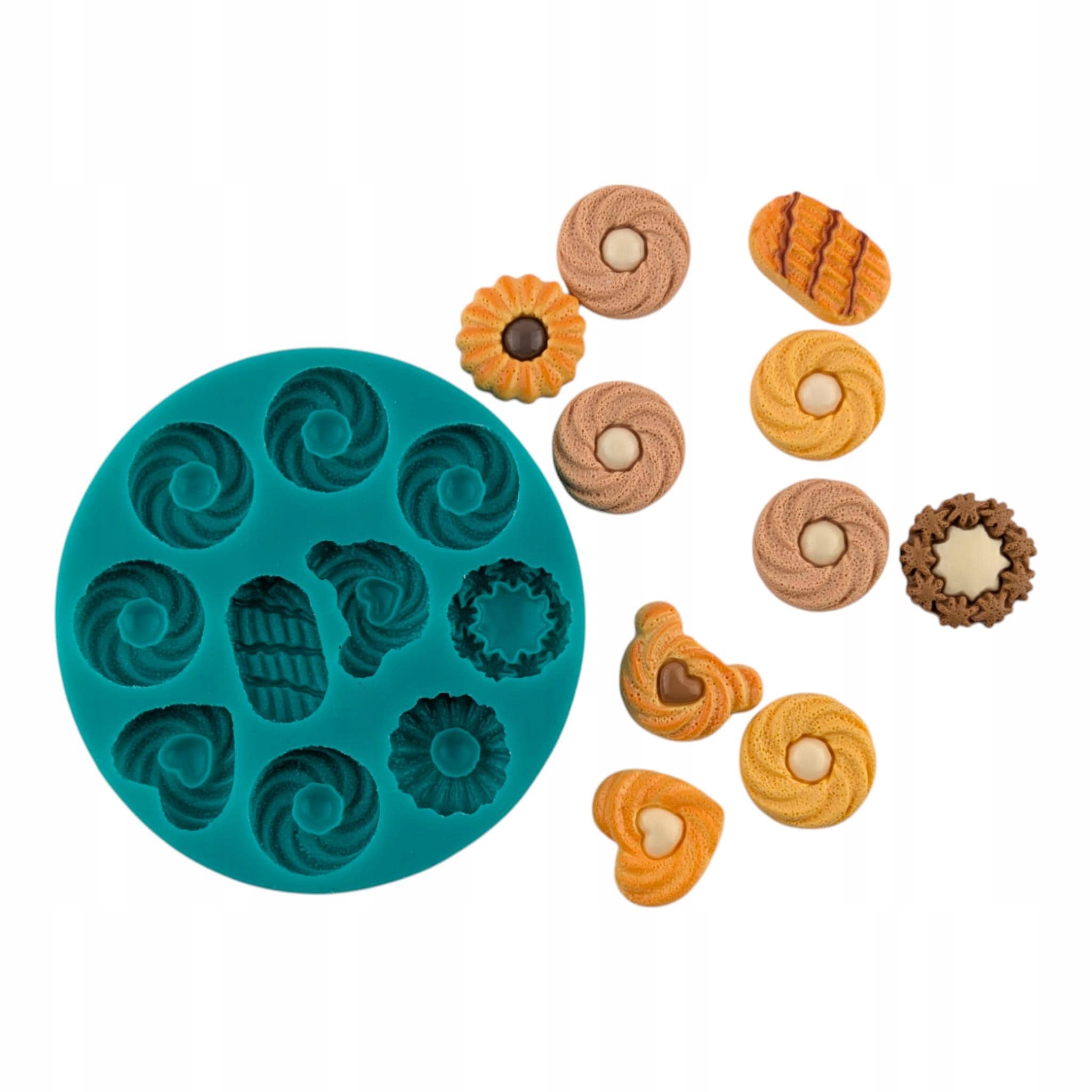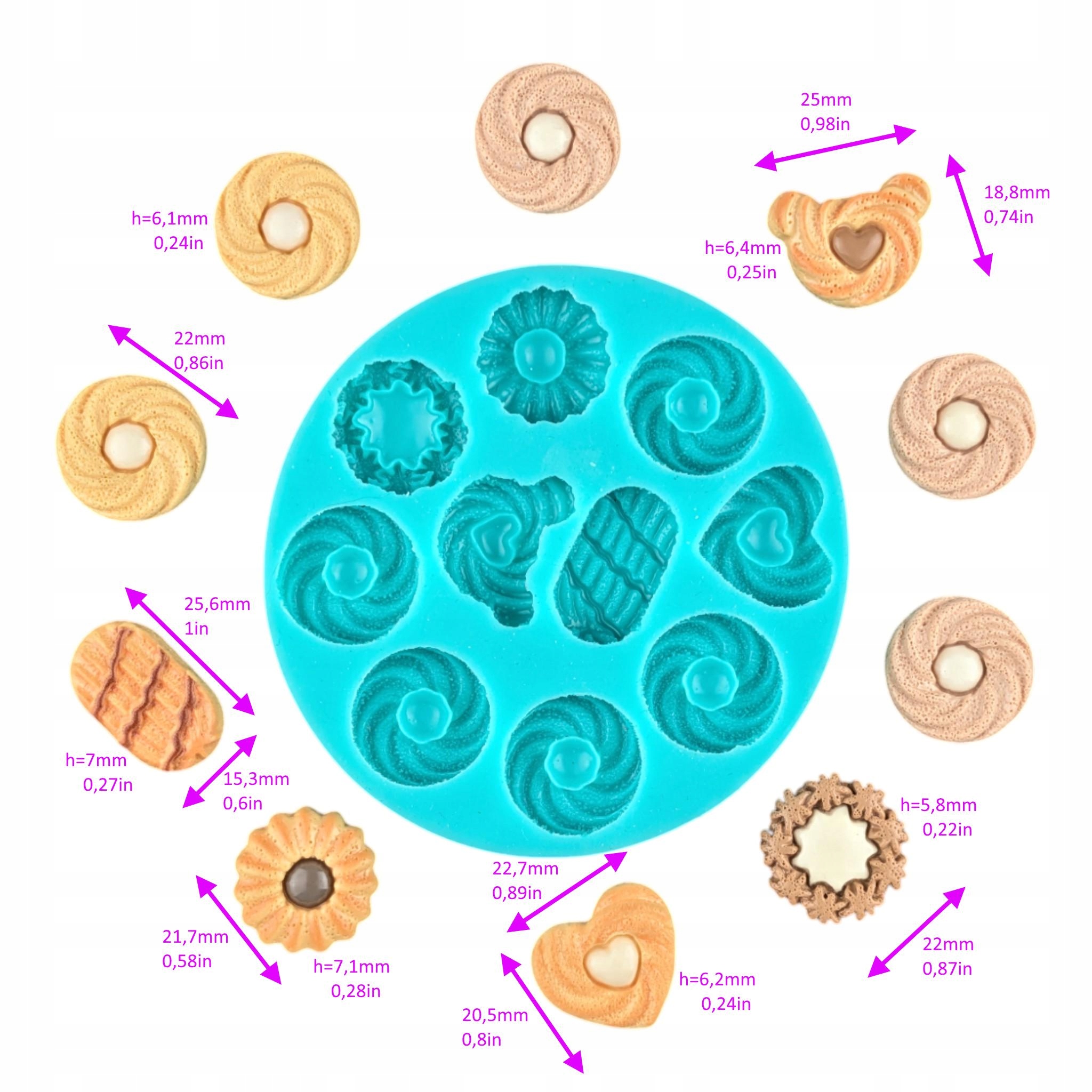Створіть прекрасні мініатюрні десерти, печиво, печиво та печиво завдяки маленькому печивах ! Ця силіконова цукеркова форма є ідеальним інструментом для створення точних форм для смоли, ароматних воску, прикрас ювелірних та шоколадних прикрас . Завдяки детальному дизайну форма дозволяє створювати реалістичні репліки печива , які чудові як ключові кільця, підвіски з ювелірних виробів або декоративні елементи. печиво для печива та орео форми забезпечують чудову текстуру та велику відтворення деталей.