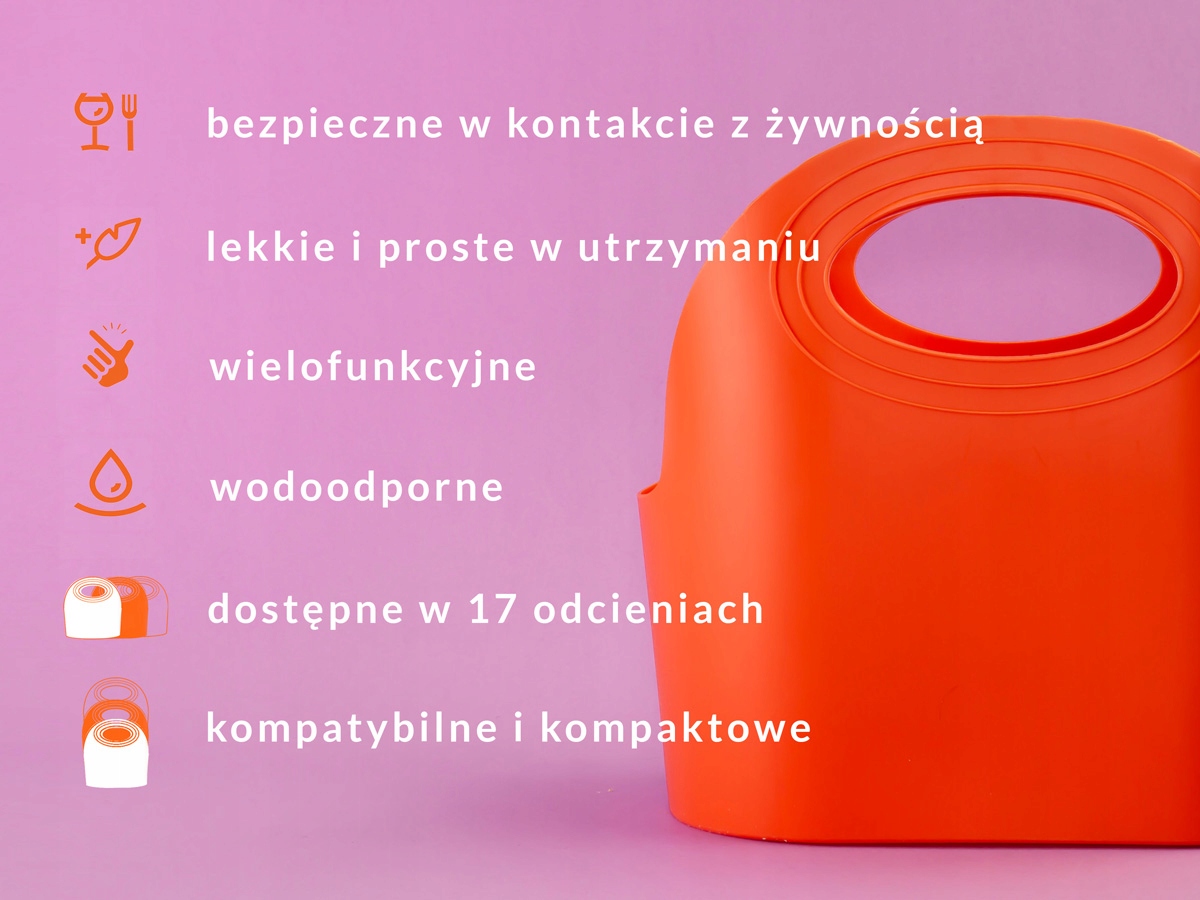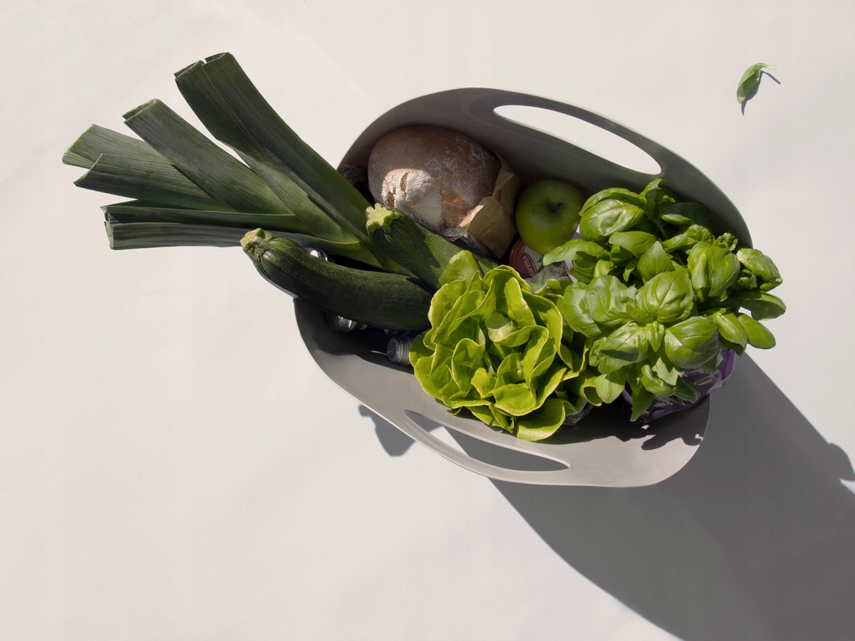 Кошик для покупок, виготовлений із гнучкого та міцного LDPE (високоміцного та еластичного поліетилену), переробленого та призначеного для повторного використання. Ергономічний дизайн дозволяє використовувати його як зручну портативну сумку. Контурна ручка розроблена для комфортного використання. Кошик не тисне в руку при завантаженні, а його вага розподіляється рівномірно. Форма посилена міні-кронштейнами, які забезпечують правильну форму.