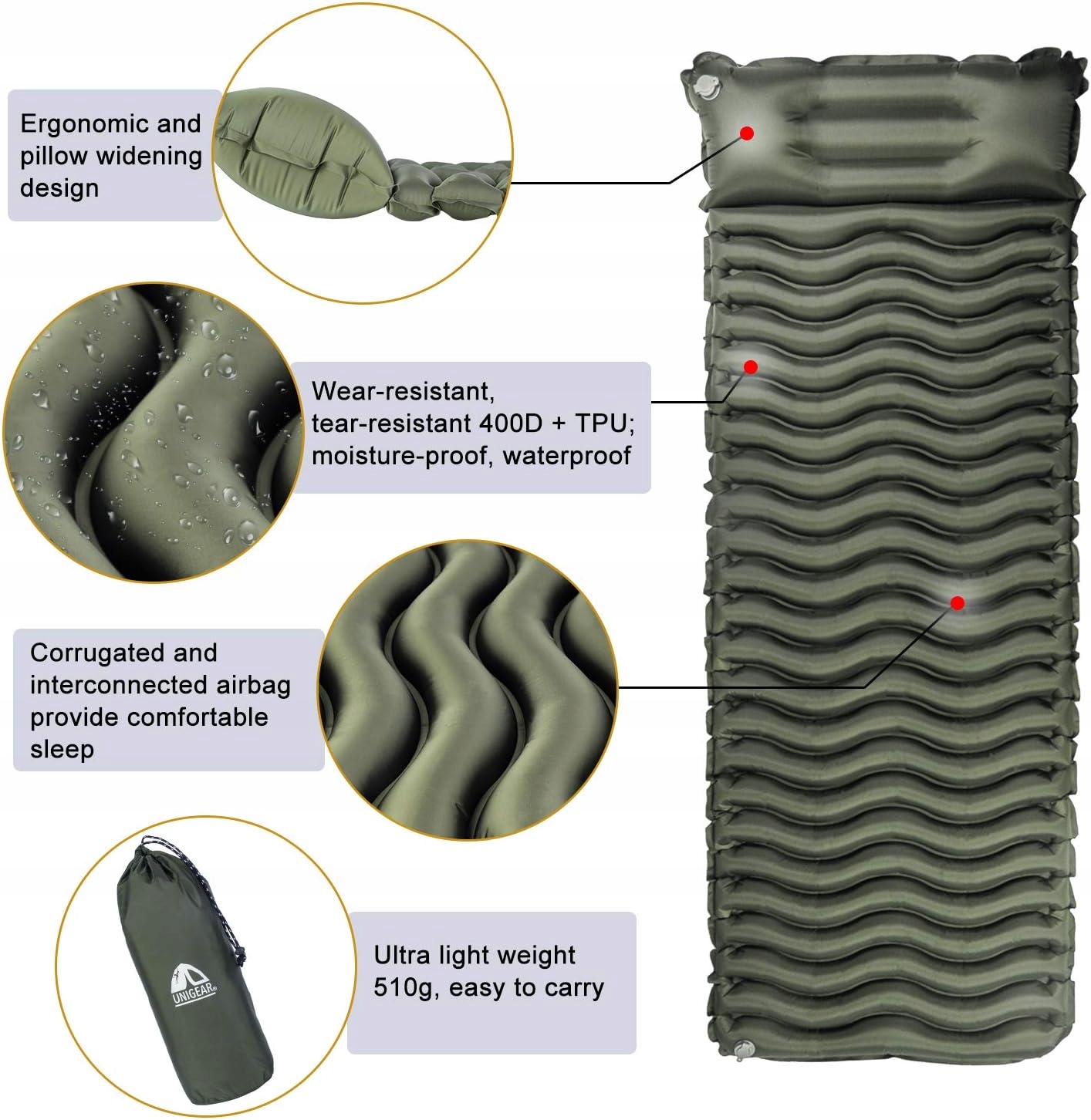 Низький шум: Багато надувних матраців кемпінгу шумують під час використання, але коли ви рухаєтесь або спите на нашому надувному спальному майданчику, ви виявите, що вона тихіша, ніж матраци ПВХ. Інший захист 2 типів матеріалів: кемпінг -килимок, поверхня ізоляційного килимка виготовлена з 40D нейлону. Перевага цього матеріалу -стійкість до споживання, вологи, надпрацювання та бризок. Внутрішній матеріал TPU має відмінну вантажопідйомність, ударну стійкість та подушку, завдяки якому ізоляційний спальний майданчик підтримує не лише в кімнатах, але й на відкритому повітрі. Простий у використанні та портативні: потрібні лише 10-15 вдихів з 75 "x 23,5" x 2,3 "(190 * 66 * 5,5 см) і після складання 9,8" x 3,9 "(25 * 10 см). Зручна підтримка тіла: Уніжар надувний сплячий мат. Тиск тіла Коли лежачи, це найзручніше, намагаючись десятки різних форм надувних утеплювачів.