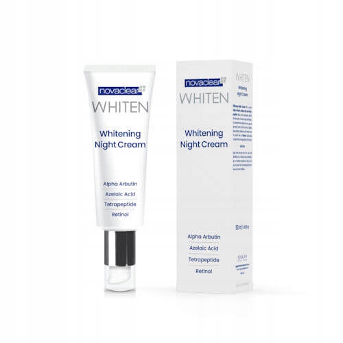 - Нічний відбілюючий крем для обличчя з активним альфа-арбутином, азелаїновою кислотою та тетрапептидом для освітлення змін кольору різного походження (сонячного, гормонального, вікового).