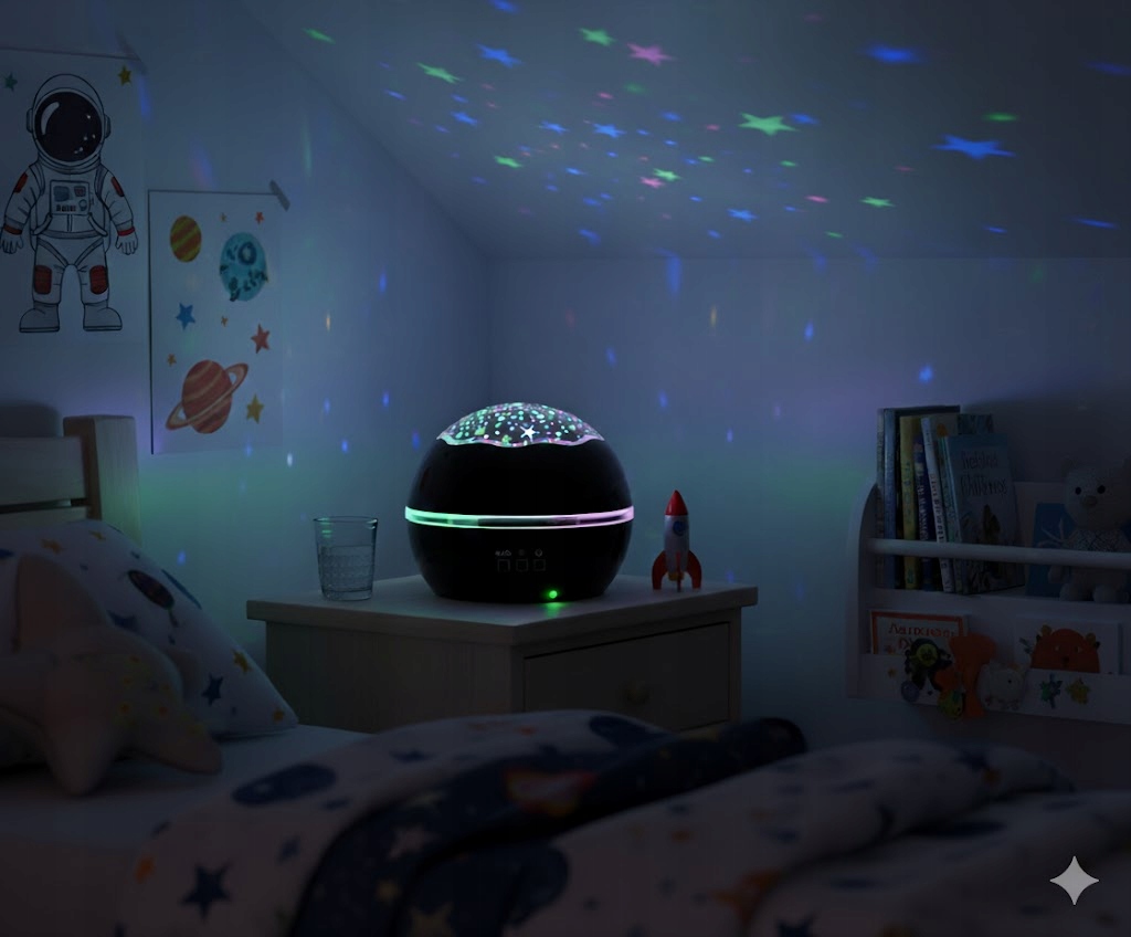 Ви можете використовувати пристрій як класичну лампу для дитячої кімнати 💡 або як проектор зіркового/морського світу 🌌🌊. Ефект чудовий і створює затишну атмосферу для сну.