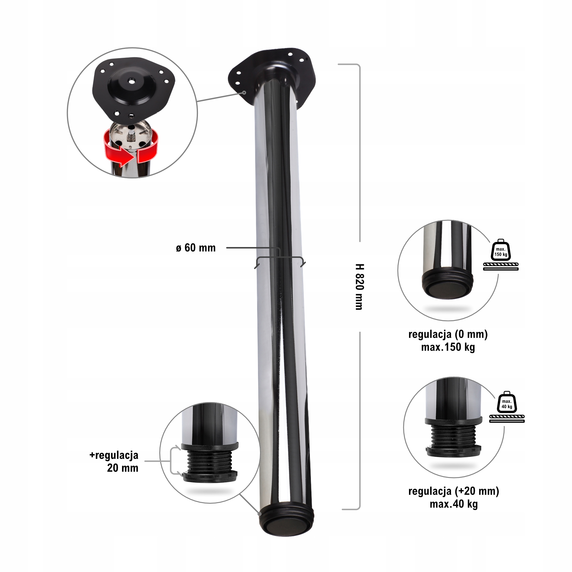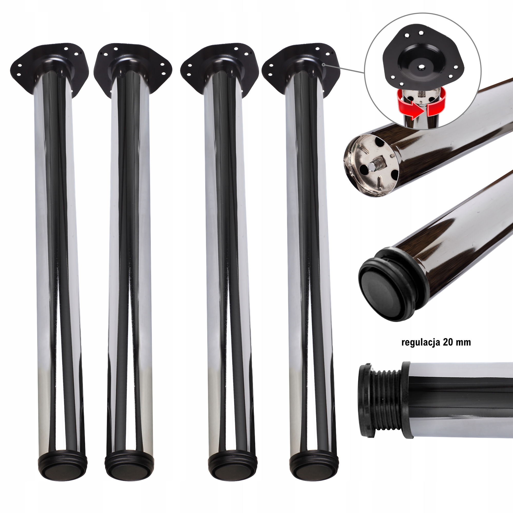 Набір з чотирьох високоякісних ніжок, які добре підійдуть на столах, партах і стільницях, як змінний елемент. Виготовлені з високоякісних матеріалів гарантують, що вони будуть стабільними та довговічними. Можливість регулювання дозволяє регулювати висоту, що буде чудово, наприклад, у випадку зі кривою підлогою.